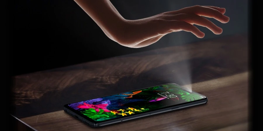 전면의 노치 영역에 탑재되어있는 ToF 카메라(LG는 공식적으로 Z 카메라 기술이라고 부르니다.)를 통해서 15~20cm 내외의 거리에 있는 사용자의 손짓을 감지, 전화 수신/거부, 다이얼 형태의 볼륨 조절, 미디어 재생, 앱 실행 등 다양한 컨트롤 기능을 제공해주고 있습니다.
