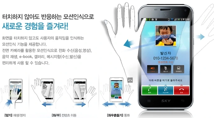 가장 먼저 에어 제스처 기능을 구현했었던 것은 지금은 부활 준비 중인 SKY(Pantech, Vega)입니다. 2011년 출시한 베가 LTE 기종에 모션인식이라는 처음 들어갔으며 이후로도 몇몇 기기에 들어갔습니다.