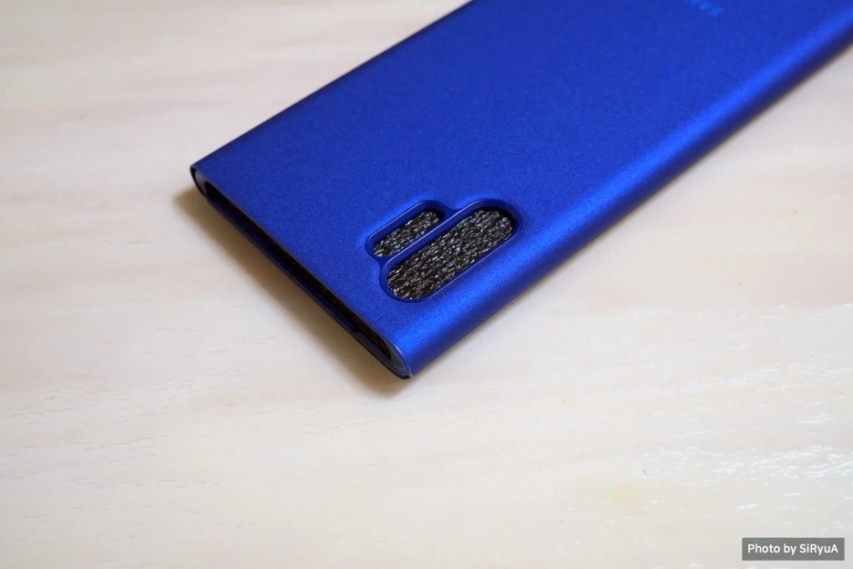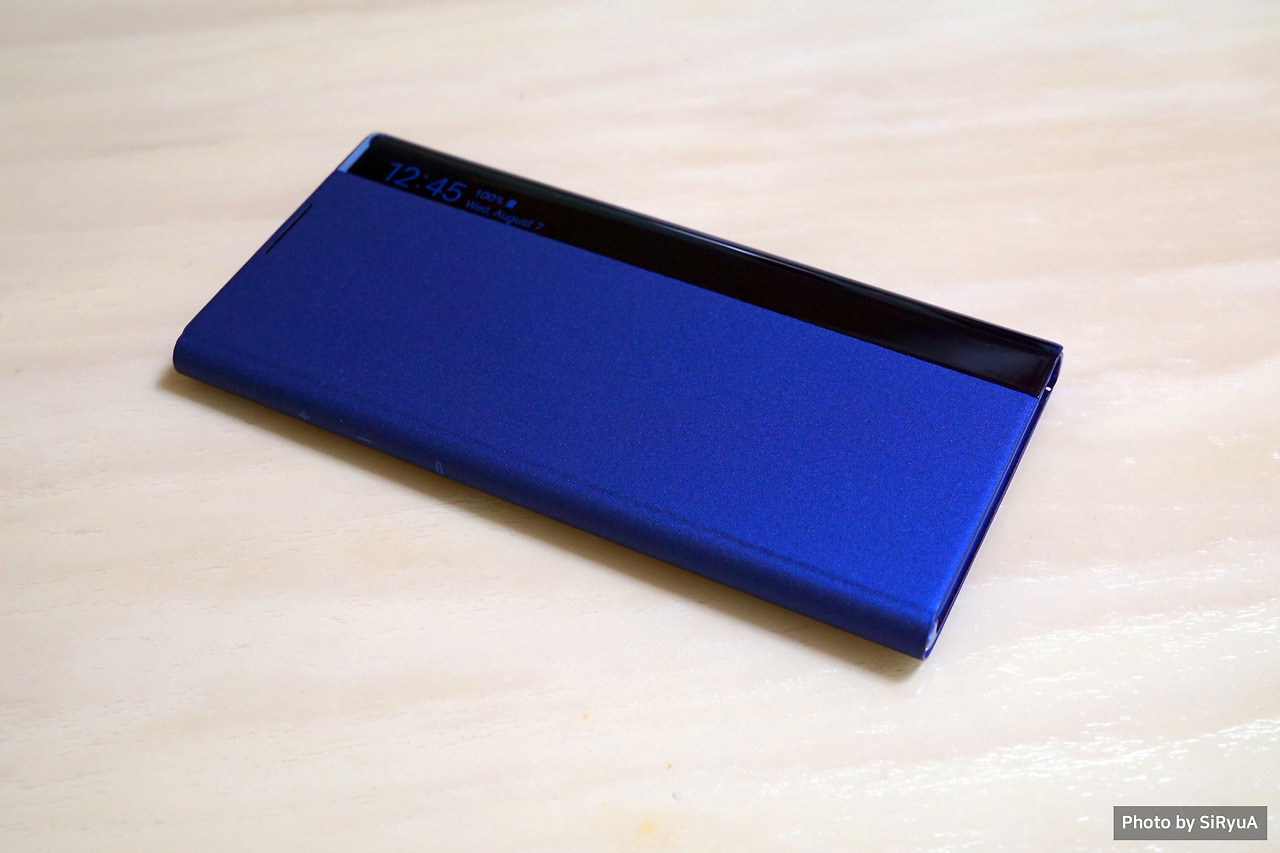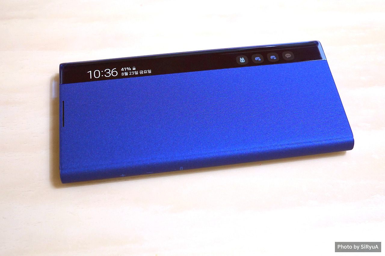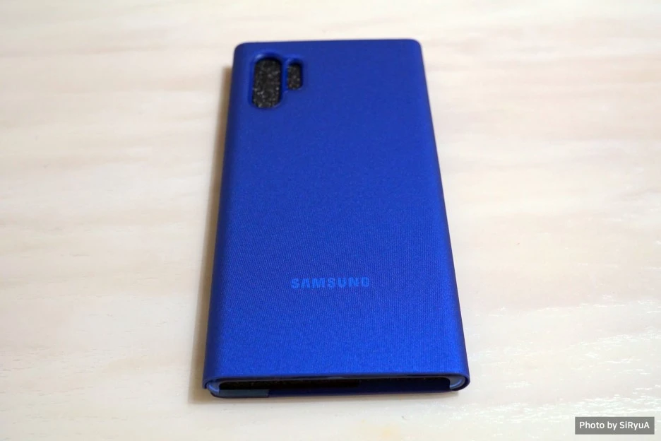 천 재질로 덮여있는 후면은 정말 깔끔하게 아래쪽 하단에만 삼성 로고가 적혀있을 뿐 그 어떠한 무늬가 없습니다. 그리고 재질이 재질이다 보니까 정말 다이어리나 수첩 같은 느낌을 많이 주고 있는데 갤럭시 노트 10 플러스와 매우 잘 어울리는 느낌입니다.