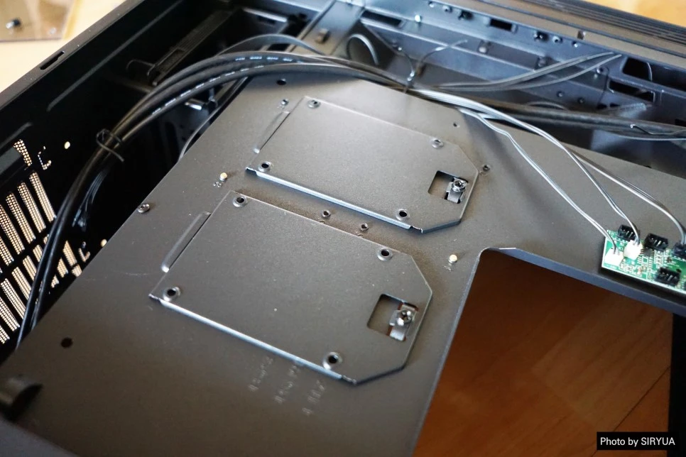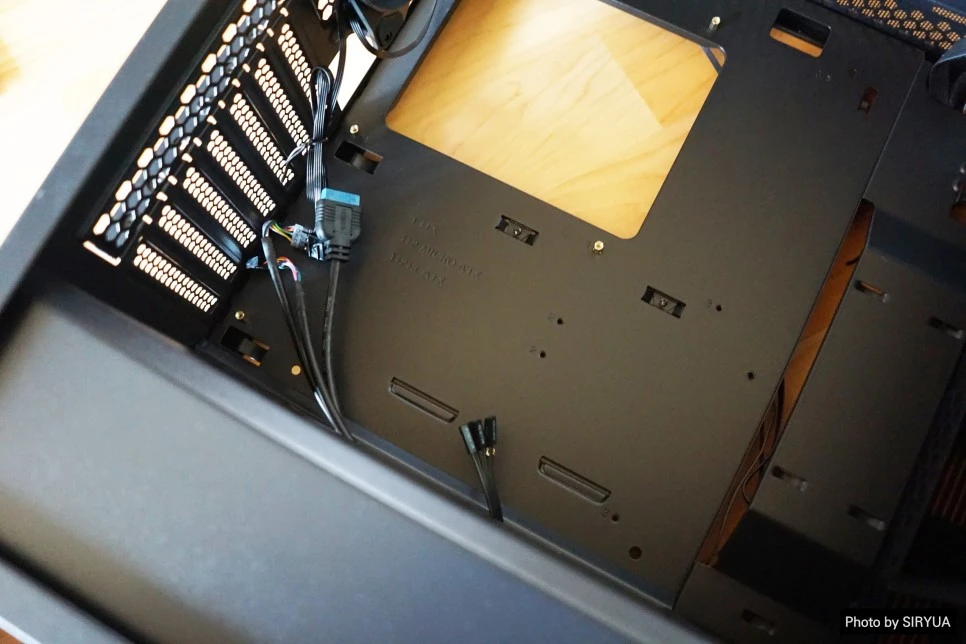 파워서플라이와 분리시켜놓고 있는 하단 철판의 끄트머리 쪽에는 두 개의 홈이 있으며, 이 홈을 통해서 전원 버튼 및 USB 케이블 등 상단 프런트에서 나오는 전선들이나 SATA 케이블 등을 빼서 정리하면 보이는 면에서는 전선을 상당히 깔끔하게 정리할 수 있습니다.