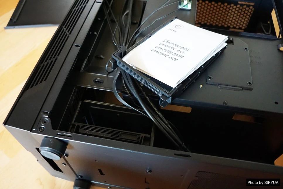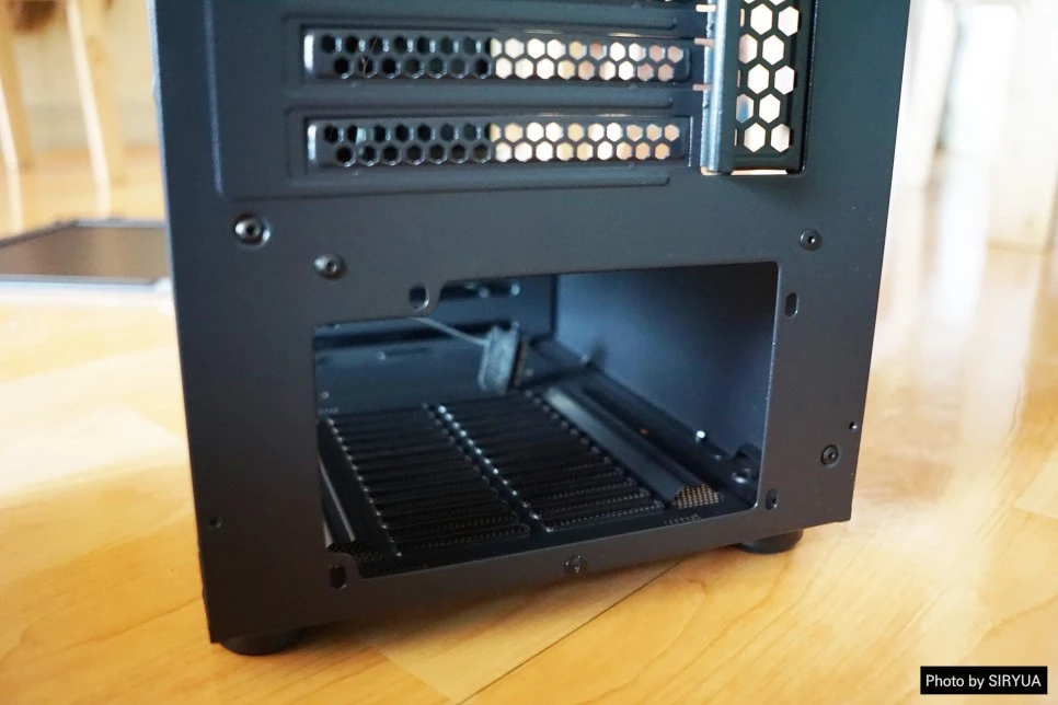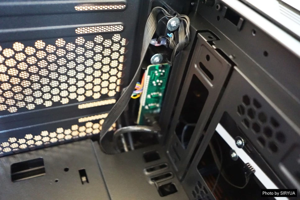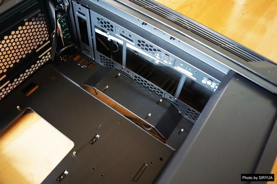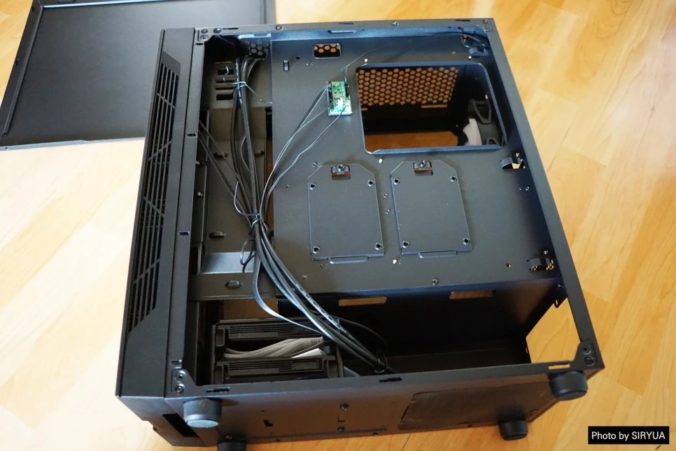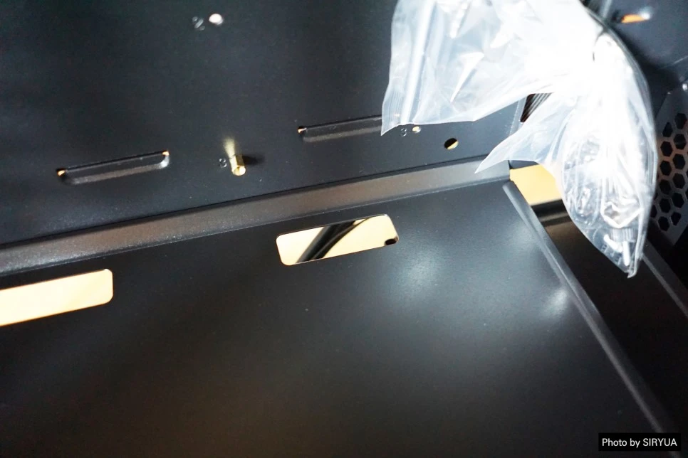 파워서플라이가 위치하고 있는 곳은 철판으로 막혀있으며, 사이사이에 틈이 있어서 대다수 배선들을 뒤로 숨길 수 있도록 되어있습니다.