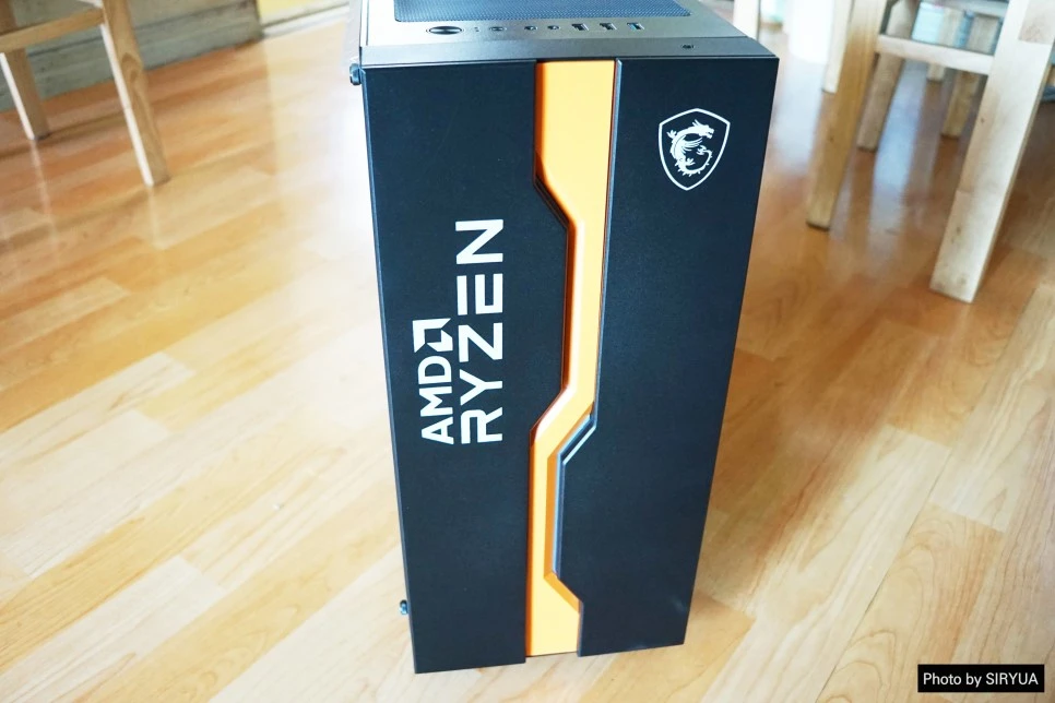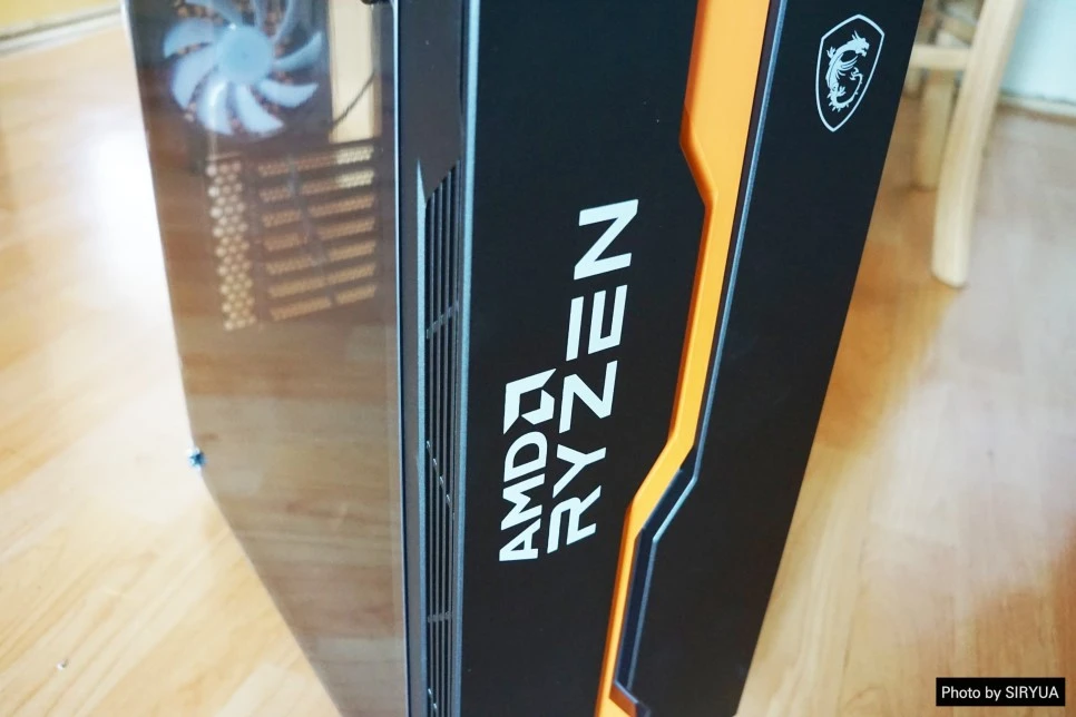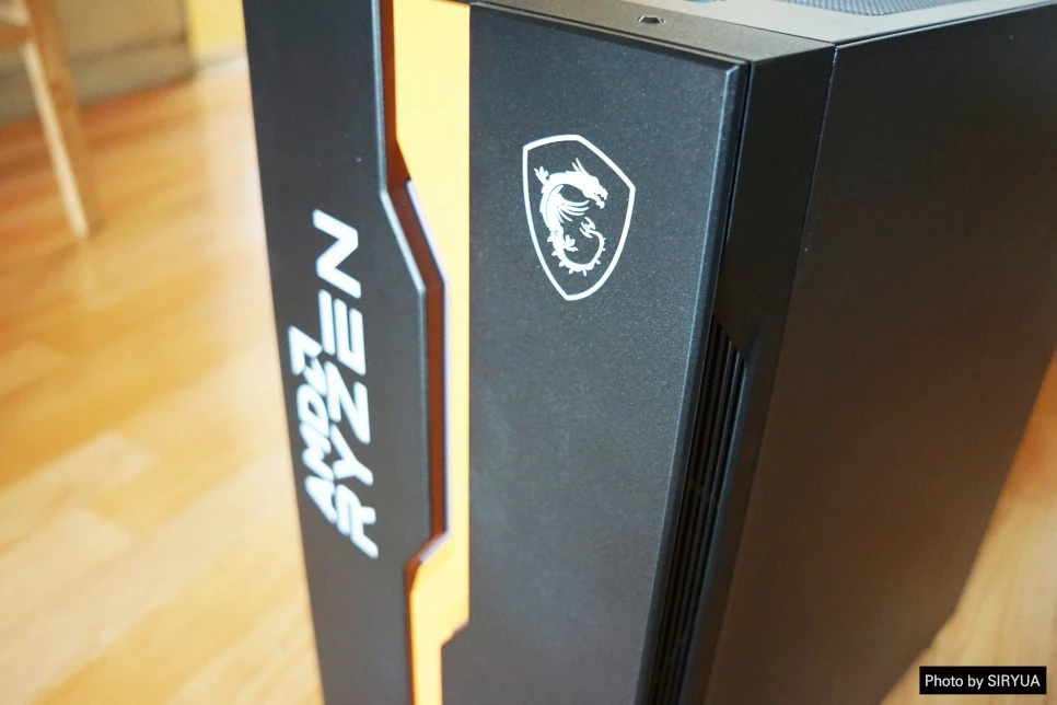 전면에는 큼지막하게 AMD 라이젠 로고가 90도로 돌아가서 새겨져있으며, 우상단에 방패 모양의 MSI 용용이 로고가 그려져 있습니다. 중앙에는 굴곡과 주황색의 컬러 배치를 통해서 포인트를 주고 있으며, 굴곡 사이 틈을 통해서 LED의 불빛이 나오도록 되어있습니다.