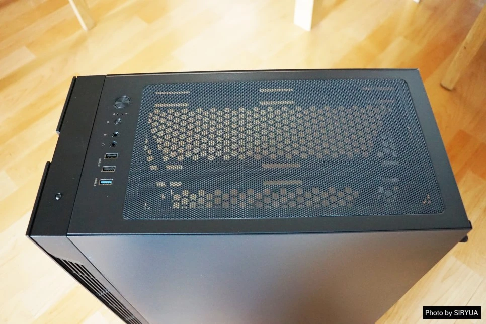 상단 프런트에는 LED 컨트롤 버튼이 제일 앞에 위치하고 있으며, 그 뒤로 전원/리셋 버튼, 마이크, 이어폰, USB 슬롯(2.0 x 2 / 3.2 x 1)이 배치되어있습니다. 그리고 상단 송풍구 쪽에 먼지가 들어가는 것을 방지하기 위한 메시 그릴 먼지 필터는 자석으로 붙어있습니다. 이에 따라 먼지가 많이 묻어있을 경우 손쉽게 떼어내서 털어내고 다시 부착하면 됩니다.