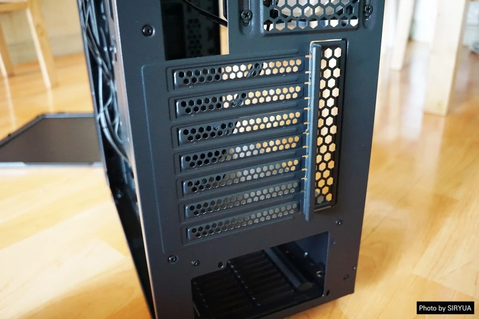 PCI 슬롯은 총 6개로 ATX 메인보드에서 사용 가능한 최대 슬롯 크기만큼 제공해주고 있으며, 일회용 타입으로 한 번 떼어내고 나면 다시 사용할 수 없는 타입입니다. 그래픽카드를 비롯하여 PCI 슬롯을 사용하는 카드를 설치할 때 필요한 포트만큼 떼어내어 사용하면 됩니다.