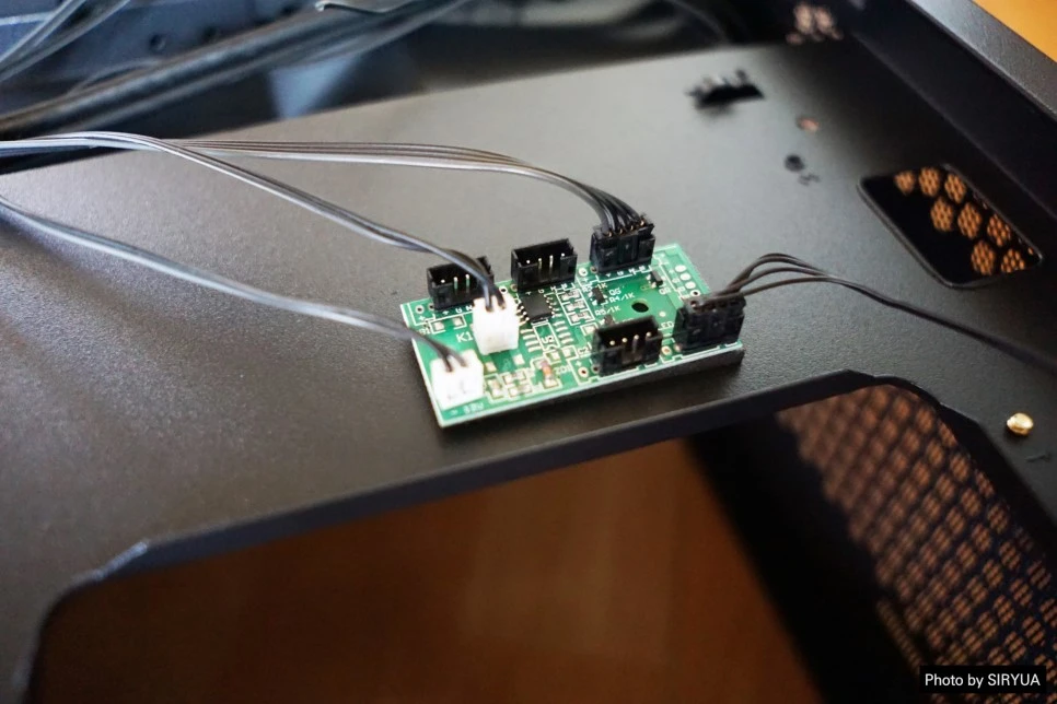 011C 케이스 같은 경우 LED 컨트롤을 지원하지 않는 메인보드를 사용하더라도 문제 없도록 LED 색상 싱크를 맞추어주는 RGB LED 컨트롤 허브가 제공되고 있습니다. 양면 스펀지 테이프를 통해서 PCB가 철판에 붙어있으며, 5개의 ARGB 헤더를 통해서 최대 5개의 LED 싱크를 맞추어줍니다. 전원은 12V SATA 전원을 사용하고 있어서 구형 제품이라도 문제없이 사용할 수 있습니다.