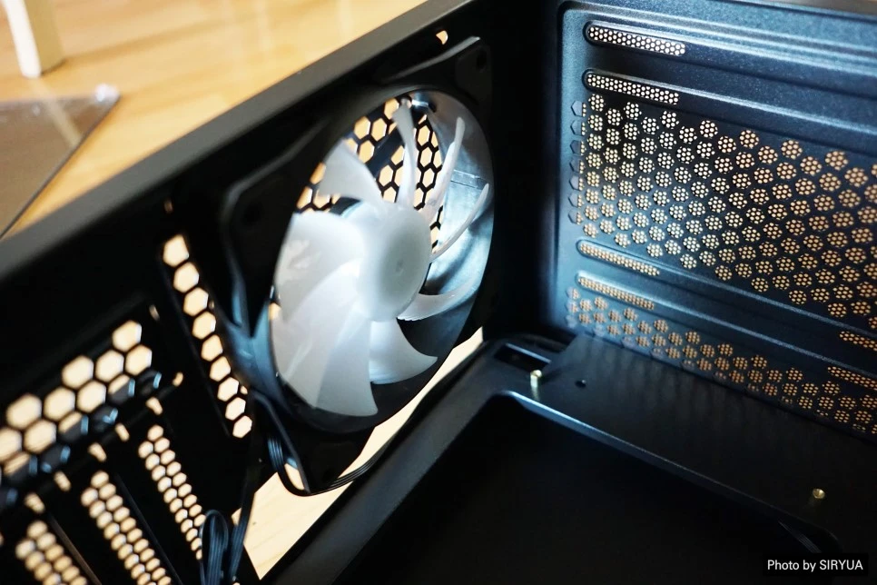 후면에 위치한 120 mm RGB 쿨링팬은 공기 흐름에 따라서 안에서 밖으로 빼어내도록 되어있습니다. 팬은 흰 색깔로 되어있고 LED는 팬 안쪽으로 위치하고 있어서 전원을 공급하고 발광을 시작하면 팬 중심부에서부터 바깥쪽으로 점점 옅어지는 그러데이션으로 비추어지는 것을 볼 수 있습니다.