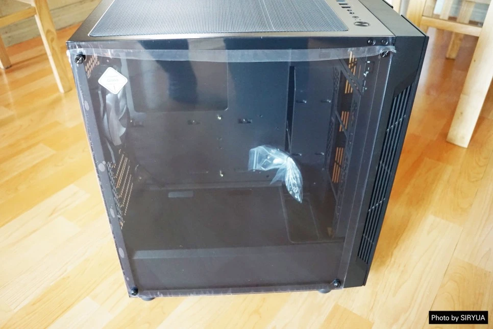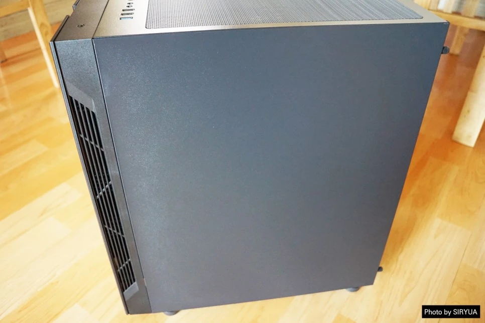 우측면 사이드 패널은 같은 경우 많은 케이스들처럼 철판으로만 되어있지만, 좌측면 사이드 패널은 경우 두께가 약 4T (4mm) 정도 되는 강화유리도 되어있습니다. 유리의 색상은 검은색으로 되어있어서 내부의 LED가 비추어지는 것들이 그대로 투과되어 나오기보다는 한 번 정도 필터링 되어 나오도록 되어있습니다.