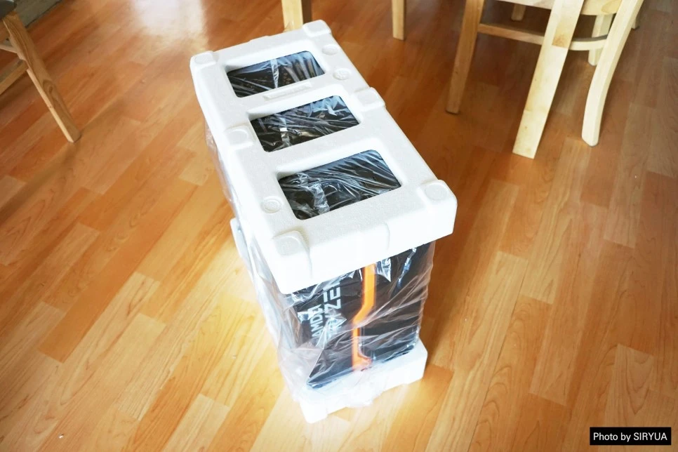 상단의 테이프를 뜯고 박스를 열어보면 많은 가전제품처럼 스티로폼 완충제와 비닐로 케이스가 안전하게 보호되고 있는 것을 확인할 수 있습니다. 박스를 이 상태로 잡고 뒤집어서 손쉽게 박스에서 케이스를 꺼낼 수 있습니다.