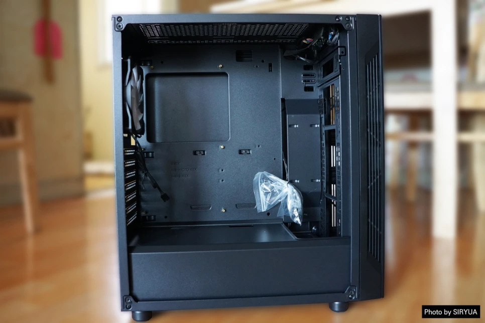 외부를 보았으니 이제 내부를 봐야겠지요? 강화유리를 열어서 내부를 보면 ATX 보드에 맞추어서 6개의 서포트가 미리 설치되어있습니다.