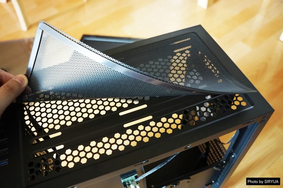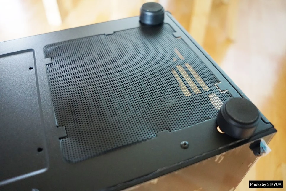 공기가 유입되는 파워서플라이 쪽에는 상단과 마찬가지로 메시 그릴로 되어있는 먼지 필터가 있습니다. 중력에 의해서 떨어지기 쉬운 위치이다 보니 자석 형태가 아니라 홈에 끼워 넣는 형태로 되어있으며, 고정한 뒤에는 상단보다 잘 붙어있지만 끼워 넣는 과정에 있어서는 너무 빳빳하게 잘 되어있어서 조금 힘이 듭니다.