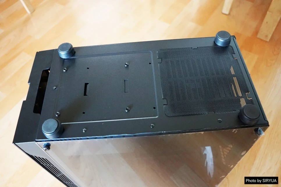 하단을 살펴보게 되면 케이스 자체가 4개의 고무패드 다리를 통해서 떠 있는 형태로 파워서플라이 부분에서 원활하게 공기 유입이 가능하고, 또 HDD의 진동으로 책상 등이 울리는 경우가 없도록 되어있습니다.