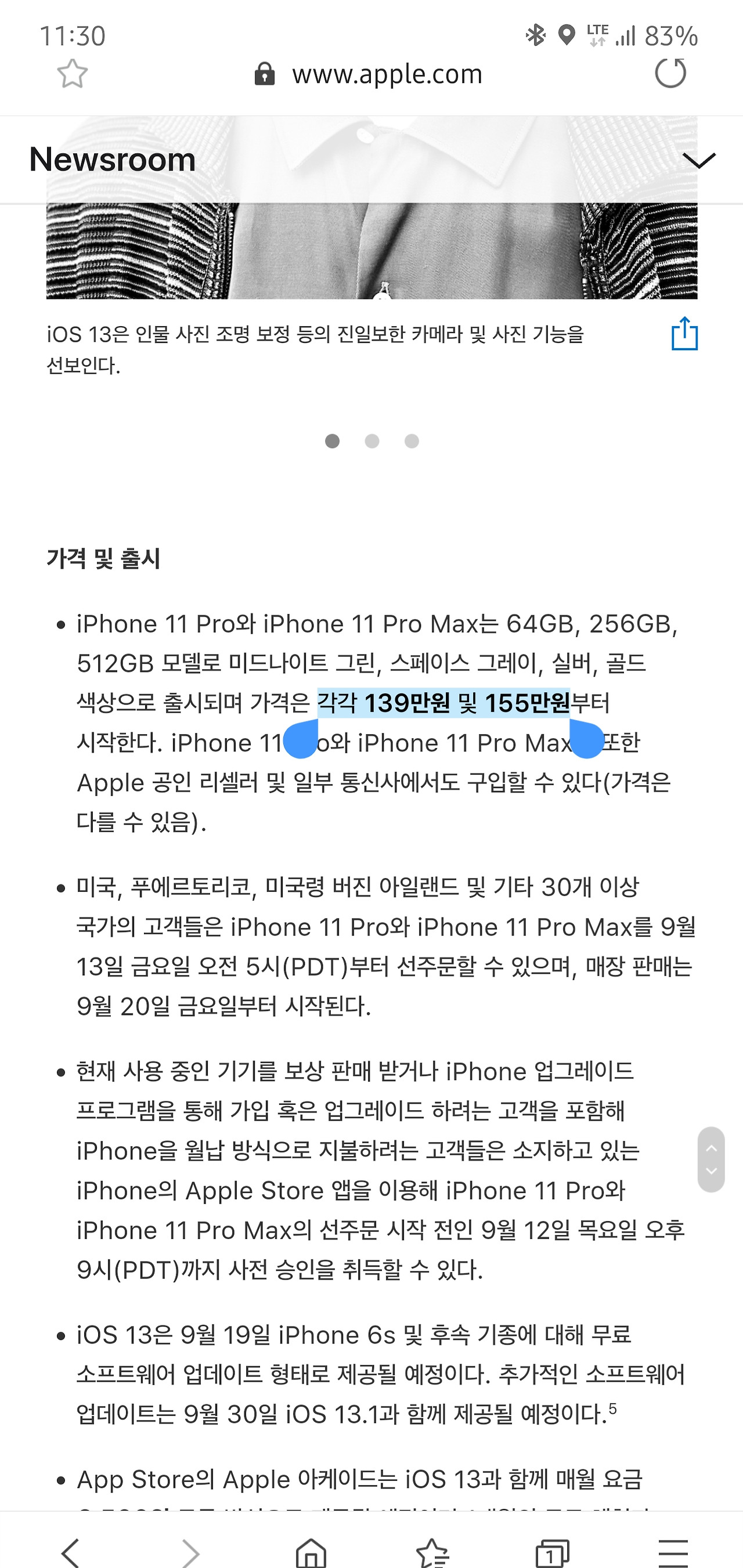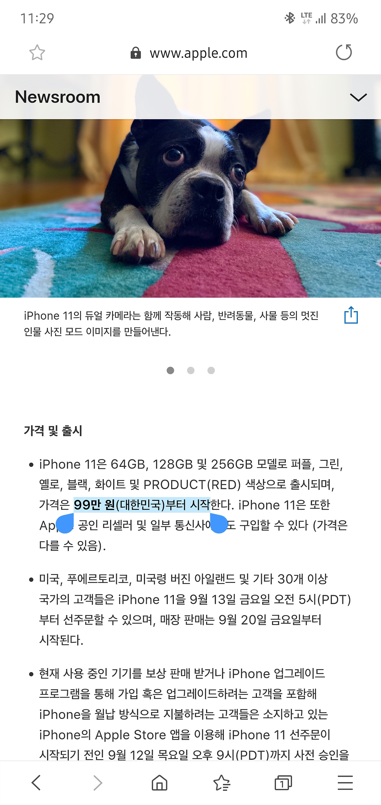 애플 뉴스룸에 아이폰 11, 프로, 프로 맥스의 가격이 공개되었습니다. 아이폰 11은 99만 원부터 시작하며, 프로는 139만 원, 프로 맥스는 155만 원입니다.