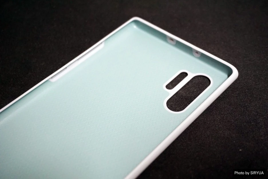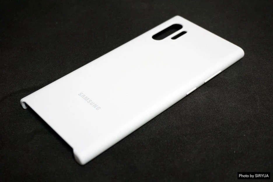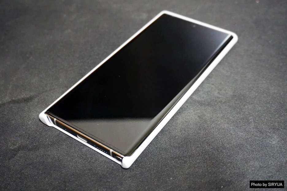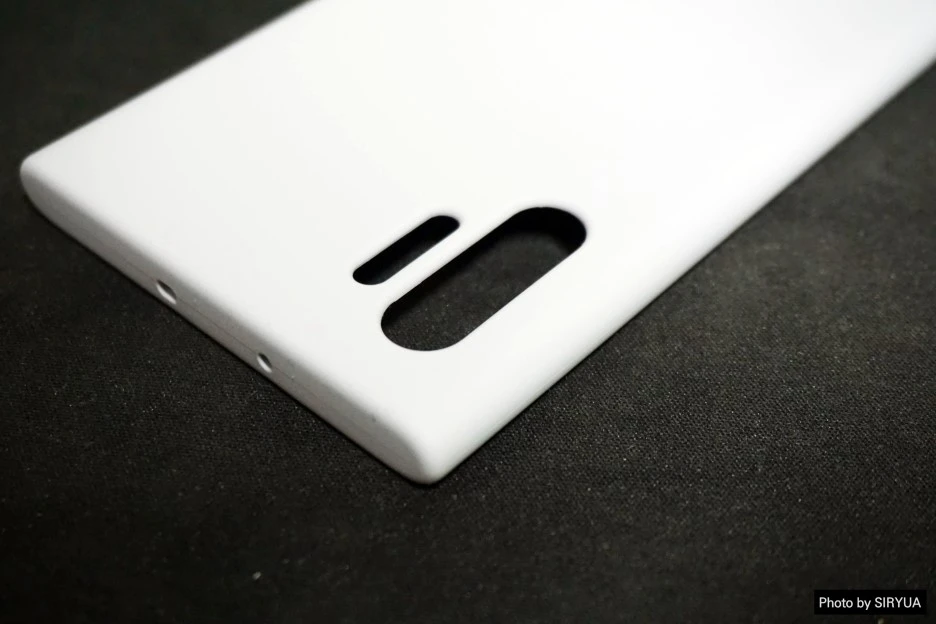 착용 후 파지해보았을 때 그립감은 꽤나 훌륭한 수준입니다. 두께가 약 1mm 정도 되는 케이스이지만 일체감이 상당히 훌륭해서 소수점 자리대의 정말 얇은 케이스를 끼운 것 마냥 갤럭시 노트 10 플러스를 케이스 끼우지 않고 파지하고 있는 것 같은 그립감을 주고 있습니다. 더군다나 실리콘 재질로 더 부드럽고 말랑말랑해져서 여러모로 괜찮다고 생각됩니다.
