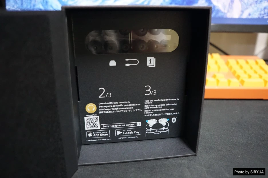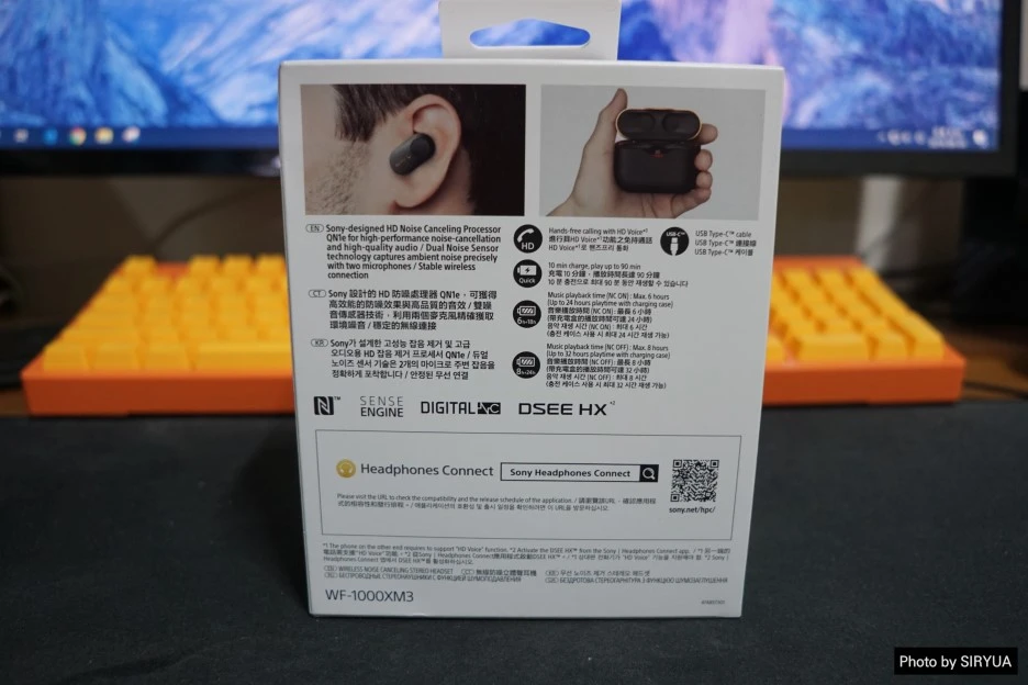 WF-1000XM3의 패키지는 전면에는 브랜드와 제품명, 그리고 제품 이미지와 함께 어떠한 종류의 제품인지 표기되어있으며, 후면에는 제품에 대한 주요 기능 및 특장점에 대해서 서술되어 설명되어있습니다. 전 세계적으로 인지도가 많은 메이저 제조사 같은 경우, 플래그십 제품의 패키지는 정말 심플한 디자인을 통해서 이 제품이 어떠한 제품이라는 것을 느낌적으로 보여줍니다. 하지만 소니의 무선 노이즈 캔슬링 코드리스 이어폰인 WF-1000XM3의 패키지는 시중에 나와있는 많은 보급형 이어폰 또는 헤드셋처럼 한 번에 많은 것을 설명해주려고 하고 있습니다. 이러한 디자인이 제품을 설명하는 데 있어서는 많은 정보를 줄 수 있기 때문에 나쁜 것은 아니지만, 그래도 어느 정도 심플함의 미학은 어느 정도 배워야 되지 않을까 생각됩니다.