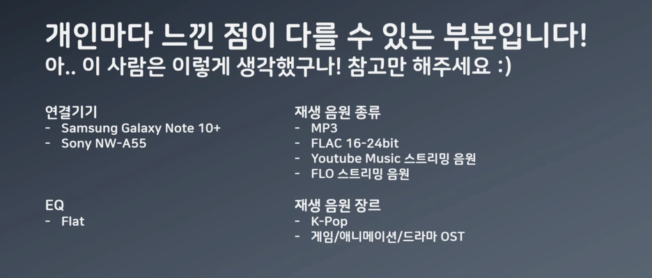 즉, 정리하자면 외부 소리가 들어오는 것에 대해서 정말 컨트롤을 잘 하고 있으며, 그 덕에 볼륨을 몇 단계 낮추어서 귀 건강을 챙기면서 사용해도 상당히 만족스러운 음감을 할 수 있습니다.