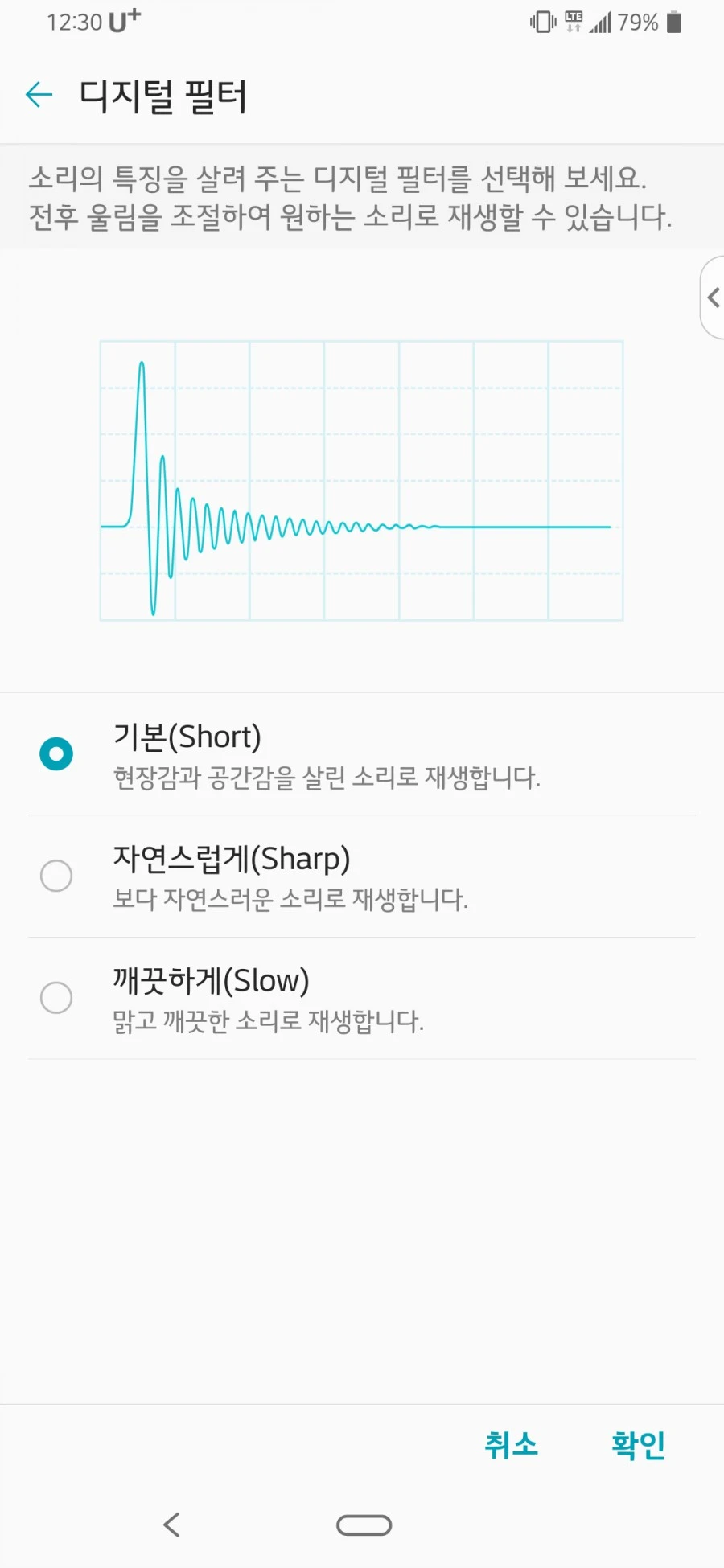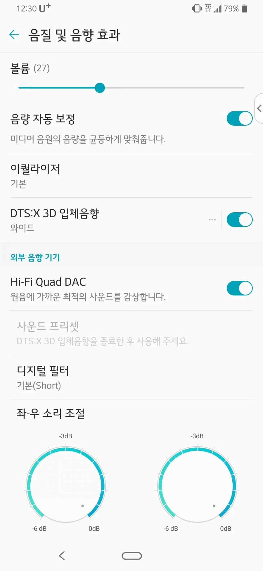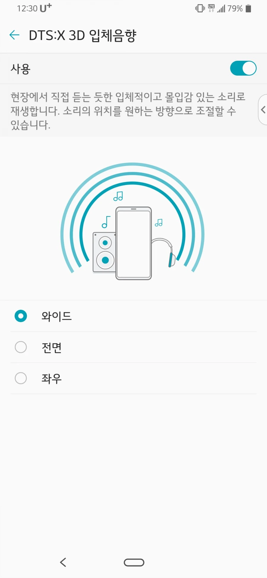 그리고 V50에는 DTS:X 3D 입체음향이라고 해서 좌우 이어폰에서 들려오는 음향을 조절해서 현장에서 직접 듣는 것 같이 조절할 수 있는 기능이 있습니다. 와이드, 전면, 좌우 총 3가지의 음향이 있고 이를 바탕으로 개인의 취향에 맞추어서 조금 더 색다른 음향을 느낄 수 있습니다. 보통 입체음향이 설정 가능하다고 하면 큰 차이점을 느끼기 힘든 경우가 많이 있는데 V50에서 제가 들고 있는 몇 개의 이어폰들 가지고 테스트해본 결과로서는 확실하게 차이가 느껴졌고 나름 괜찮았습니다.