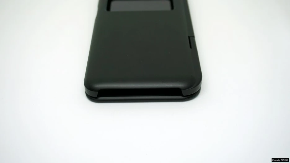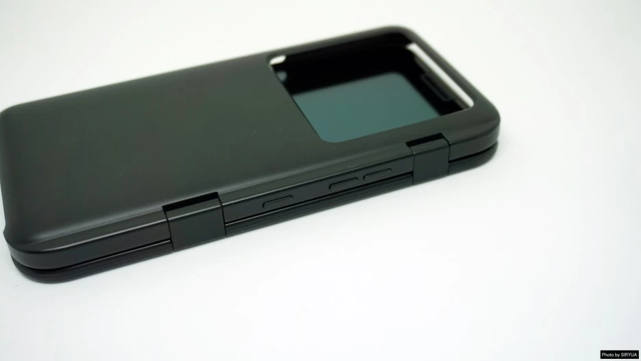 측면 버튼에 있어서는 전원 버튼은 타공 및 마감되어 있어 직접적으로 버튼을 누를 수 있게 되어있지만, 볼륨 버튼과 어시스턴트 버튼 같은 경우 힌지가 있다 보니까 버튼을 누를 수 있도록 추가적인 기구 처리로 버튼을 연장하고 있습니다. 이에 따라서 듀얼 스크린 커버를 착용할 때는 전원 버튼 부분부터 끼워 넣고 이후 볼륨 버튼 쪽을 끼워 넣어야 합니다.