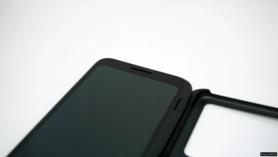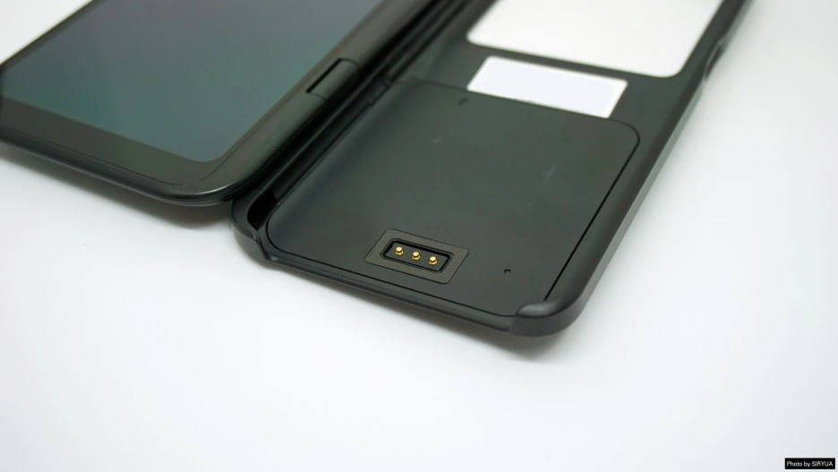 듀얼 스크린 커버를 펼쳐보면 모서리가 라운드 처리되어 있는 6.2인치 디스플레이가 보이며, 본체가 고정되는 쪽 하단에는 포고 핀이 위치하고 있는 것을 볼 수 있습니다. 앞서 이야기 한 것처럼 저 포고 핀을 통해서 전원을 공급받으며 NFC를 통해서 디스플레이 정보를 전달받습니다. 그리고 디스플레이 위에는 길게 홈이 나있으며 이 부분을 통해서 커버가 덮어져 있다고 하더라도 통화 스피커의 소리를 깔끔하게 들을 수 있습니다.