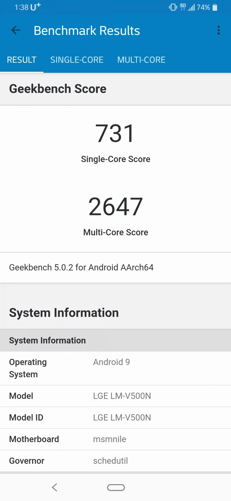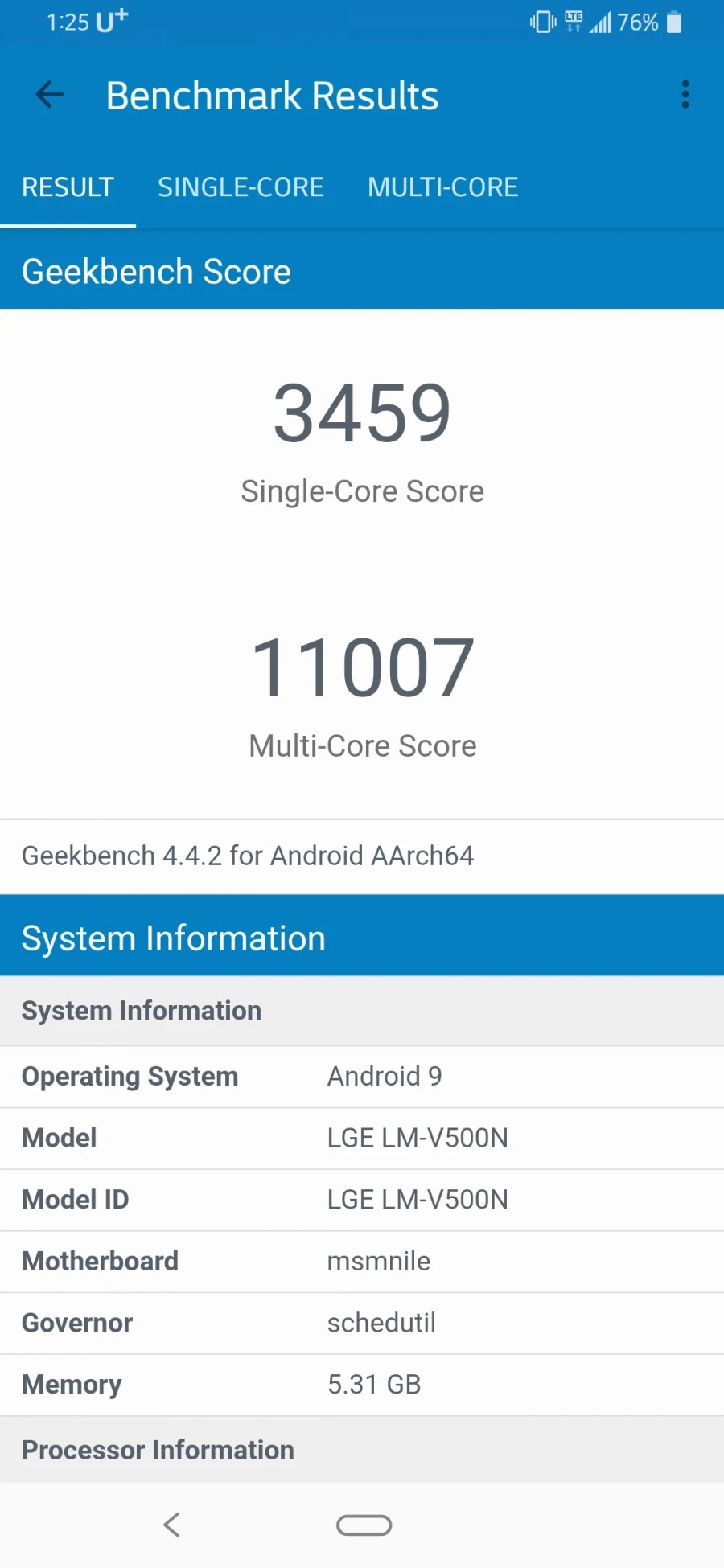 LG전자의 프리미엄 제품 라인업에 포함되어 있는 V50은 AP로 Snapdragon 855를 사용하고 있습니다. 855 같은 경우 파생되는 AP를 통해서 ARM 기반의 Windows 10을 구동하고 있기 때문에 성능적인 면에서 상당히 큰 기대감이 높습니다. 이를 바탕으로 Geekbench 4(괄호 안은 5 버전)을 통해서 성능 측정을 진행해본 결과 싱글 코어 3,459(731) 점, 멀티 코어 11,007(2,647) 점이 나왔습니다.