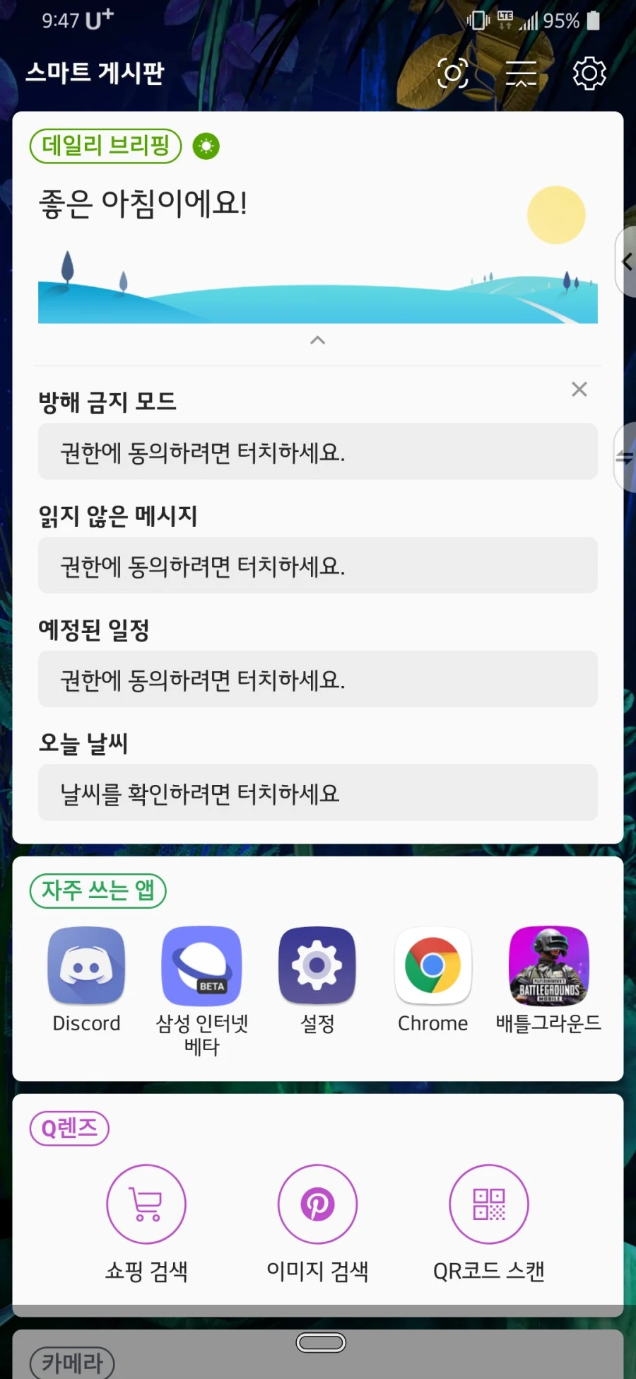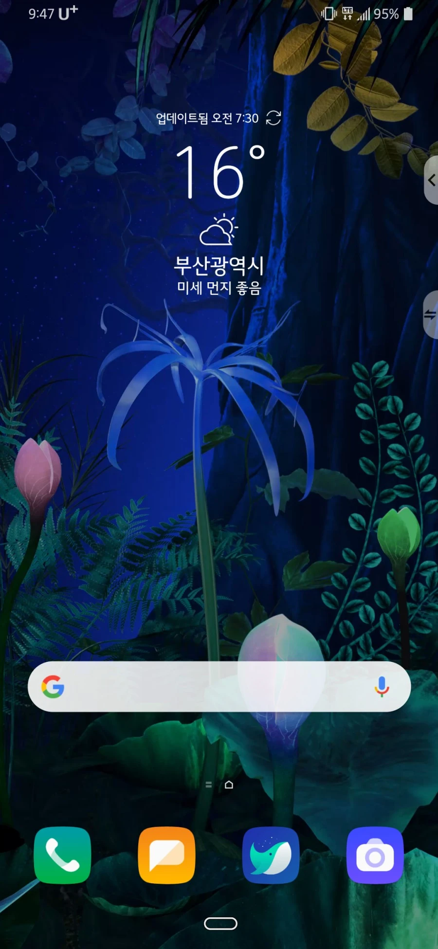 V50은 LG전자에서 안드로이드를 기반으로 개발한 자체 UX를 사용하고 있습니다. 이를 가장 먼저 쉽게 확인할 수 있는 부분이 있다면 바로 홈 화면입니다. 기본 설정값을 기준으로 왼쪽 가장 마지막 페이지는 스마트 게시판이라고 해서 단말기의 각종 정보들을 브리핑해주는 페이지가 있으며, 별도의 앱 서랍이 없이 아이폰처럼 홈 화면에 설치되어 있는 모든 애플리케이션이 배치되어 있습니다. 그리고 이는 사용자의 설정에 따라서 앱 서랍을 활성화해서 사용할 수 있습니다.