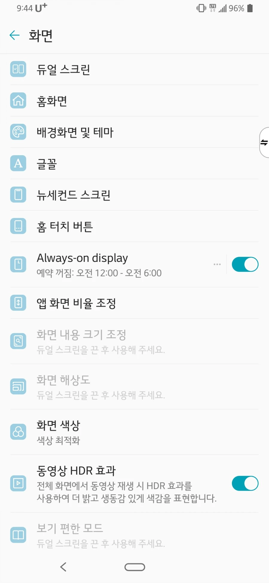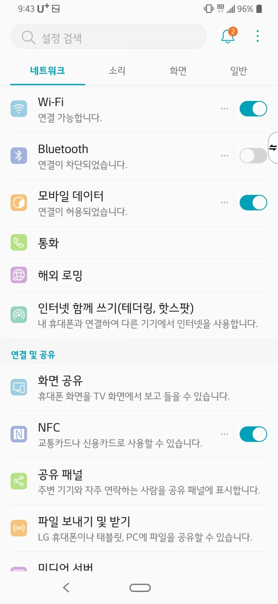 많은 제조사들이 설정 앱에서 항목들을 탭으로 나누어두던 시절이 안드로이드 5.x 롤리팝 시절까지였던가요? LG UX에서는 안드로이드 9.0 파이에서도 기본 값으로 '탭 보기' 옵션이 유지되고 있으며, 안드로이드 기본 설정 앱처럼 출력되게 하는 '목록 보기' 옵션은 메뉴를 통해서 제공되고 있습니다.