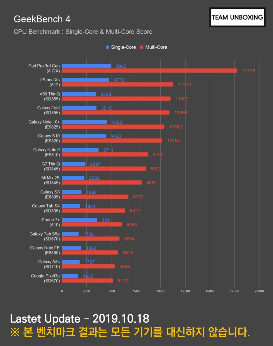 경쟁 AP인 Exynos 칩셋을 사용하고 있는 S사의 동 세대 제품들과 비교했을 때는 싱글 코어 성능에 있어서는 떨어지지만 그만큼 멀티 코어 성능에 있어서는 더 나은 성능을 보여주고 있습니다. 즉, 단일 애플리케이션 실행 및 사용에 있어서는 떨어지지만 멀티태스킹에 있어서는 더 나은 성능을 볼 수 있습니다.