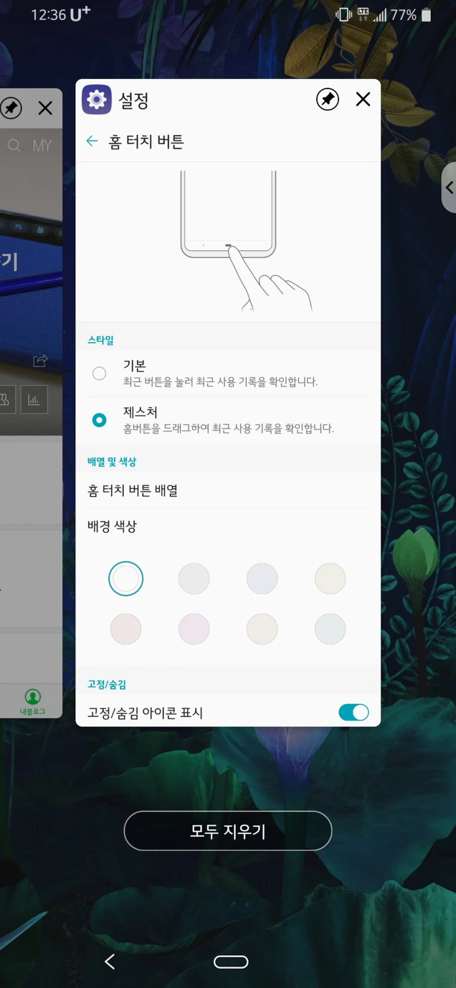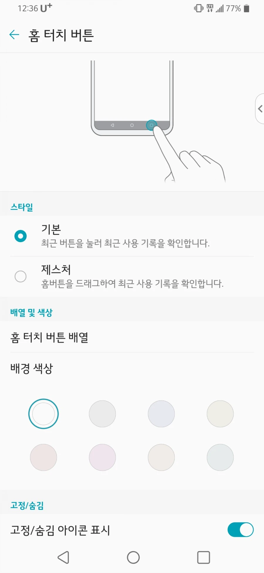 내비게이션 바(홈 터치 버튼) 같은 경우 기본(백/홈/멀티태스킹 3 버튼)과 안드로이드 9.0부터 추가된 제스처 두 가지를 선택할 수 있으며, 배경 색상 조절 및 고정/숨김 아이콘 표시 유무 등을 설정할 수 있습니다.