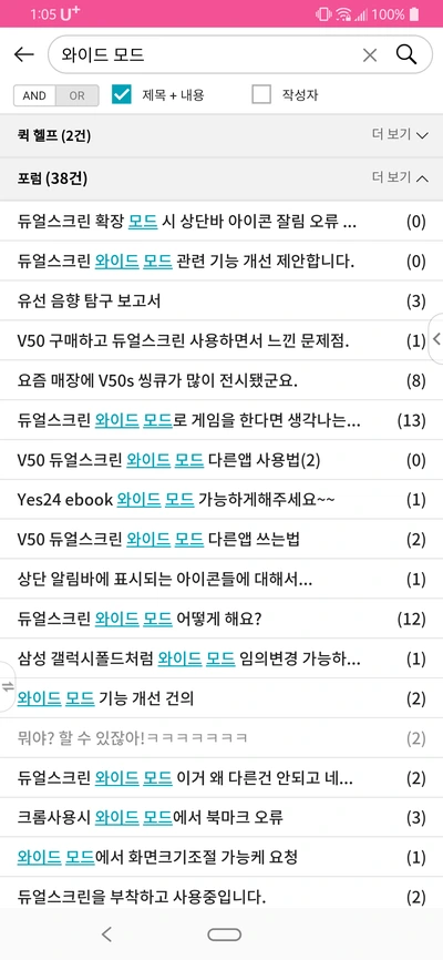 이외에도 사용할 수 있는 앱이 한정적으로 정해져 있다는 점부터 시작해서 화면 크기 조절 등 여러 가지 듀얼 스크린 와이드 모드에 관련해서 불편함을 개선했으면 한다는 내용부터 시작해서 더 나은 방향으로 나아가기 위한 제안이 LG전자 퀵 헬프 포럼에 여럿 올라와 있습니다. 하지만 이 건의들 중에서 검토해보겠다고 답변 달린 글은 몇 없을뿐더러 차기작으로 나온 V50s에서도 동일한 문제점이 그대로 발생하고 있습니다.