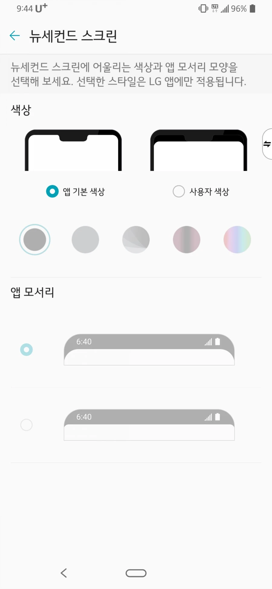 노치 디스플레이 개념 자체가 사람마다 호불호가 분명하게 갈리고 있는 요소 중 하나이다 보니까 LG전자에서도 다른 제조사들과 마찬가지로 노치 영역을 가릴 수 있는 기능을 색상 지정 형태로 제공해주고 있습니다. 앱 기본 색상을 하게 될 경우 기존의 상단 바처럼 앱에 지정되어 있는 다이내믹 상단 바 설정값에 따라서 노치 영역의 색상이 지정되고 사용자 색상을 지정할 경우 정해져 있는 다섯 가지 형태로 색상을 지정할 수 있습니다.