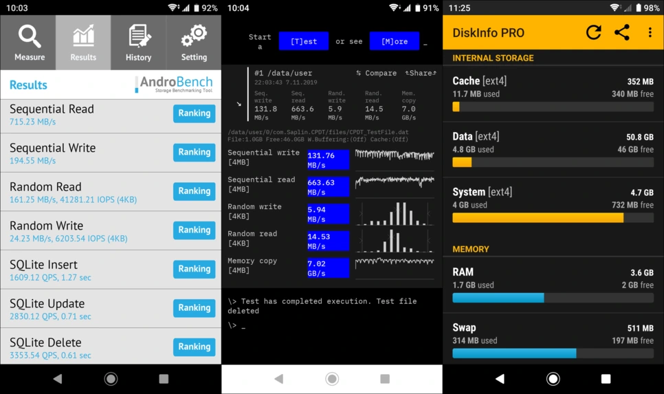 이전 제품이었던 엑스페리아 XZ와 엑스페리아 XZ1의 가장 큰 차이점 중 하나를 이야기한다면 바로 저장소의 메모리 종류가 바뀌었다는 것입니다. 엑스페리아 XZ 같은 경우 스냅드래곤 820을 사용하고 있음에도 불구하고 저장소가 eMMC5.1을 사용하고 있어 알게 모르게 제 성능을 발휘하지 못하고 다른 단말기에 비해서 조금 느리다는 평가를 많이 받았습니다. 하지만 엑스페리아 XZ1은 UFS2.1을 탑재했고 그 결과 전반적인 저장소 성능이 엑스페리아 XZ와는 비교하기 힘들 정도로 큰 폭으로 향상되어서 쾌적하게 사용할 수 있습니다.