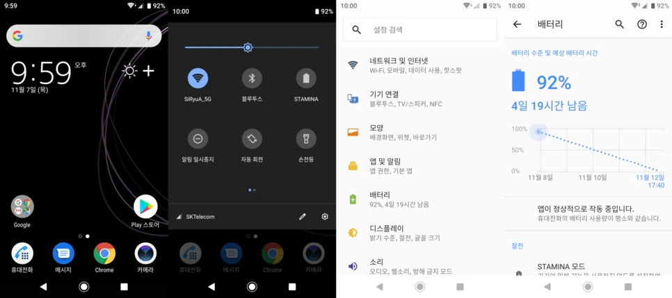 여담으로 소니의 엑스페리아 단말기들은 배터리 절전 옵션으로 스태미나 모드를 지원하고 있습니다. 성능적으로 다소 제약이 생기기는 하지만, 2700mAh 배터리라고는 생각되지 않을 정도로 예상 배터리 시간이 며칠이 잡힐 정도로 대기전력이 상당히 훌륭하며, 실 사용에 있어서도 하루 정도는 거뜬하게 사용할 수 있을 정도의 배터리 효율을 보여주고 있습니다.