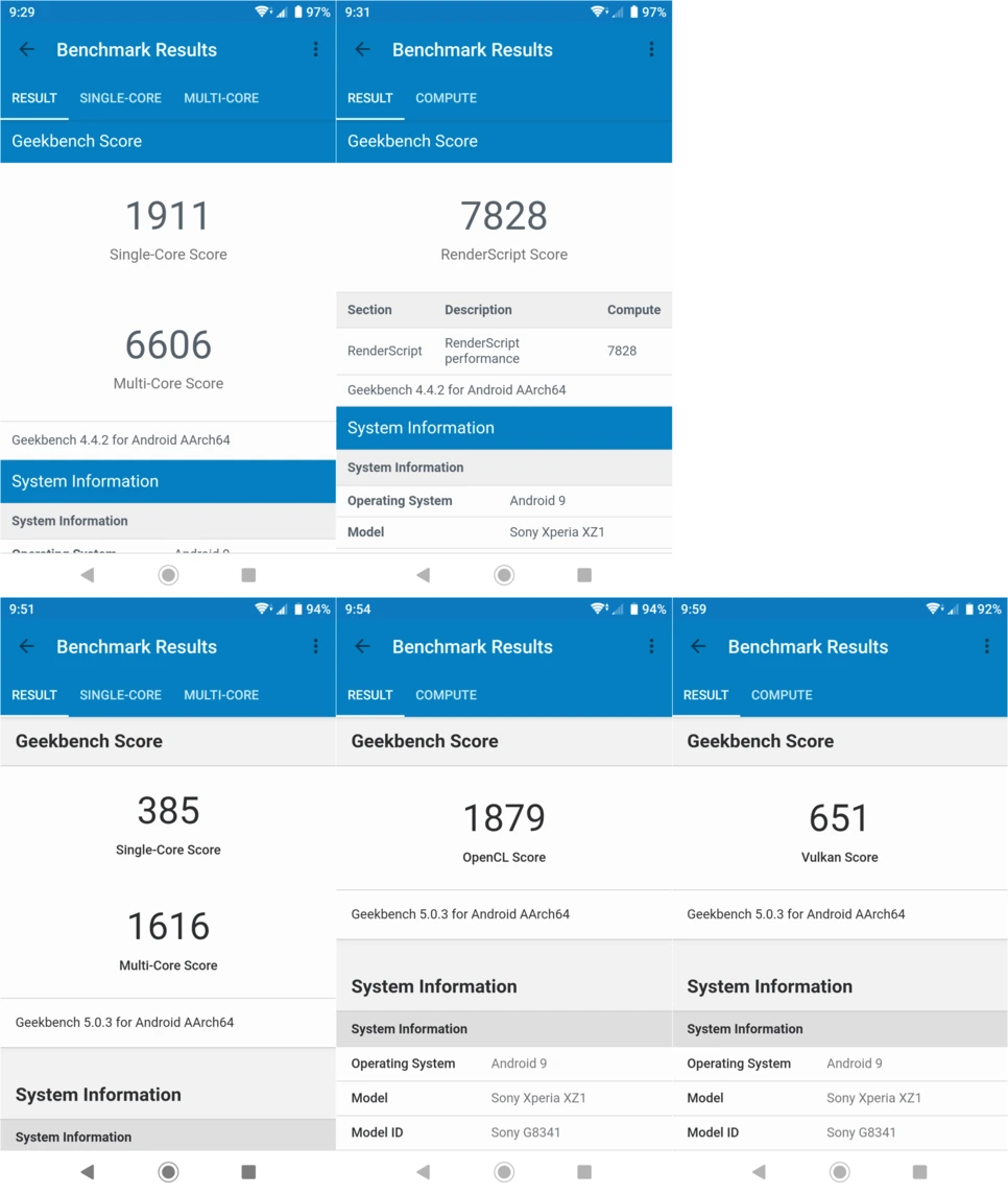 엑스페리아 XZ1은 퀄컴사의 스냅드래곤 835 AP와 4GB의 LPDDR4X 메모리를 사용하고 있습니다. 출시 시점인 2017년 기준으로 4GB 메모리는 평균 수준의 메모리였으며 스냅드래곤 835는 상당히 좋은 성능을 제공해주는 AP 중 하나입니다. 이를 바탕으로 큰 기대감을 가지고 긱벤치 4(긱벤치 5)를 구동 시켜본 결과, 싱글 코어 1911점(385점), 멀티 코어 6606점(1616점), 랜더 스크립트 7828점(Open CL 1879점 / Vulkan 651점)으로 지금 사용하는 데 있어서도 가볍게 사용한다면 큰 부담 없이 사용할 수 있는 성능을 제공합니다.