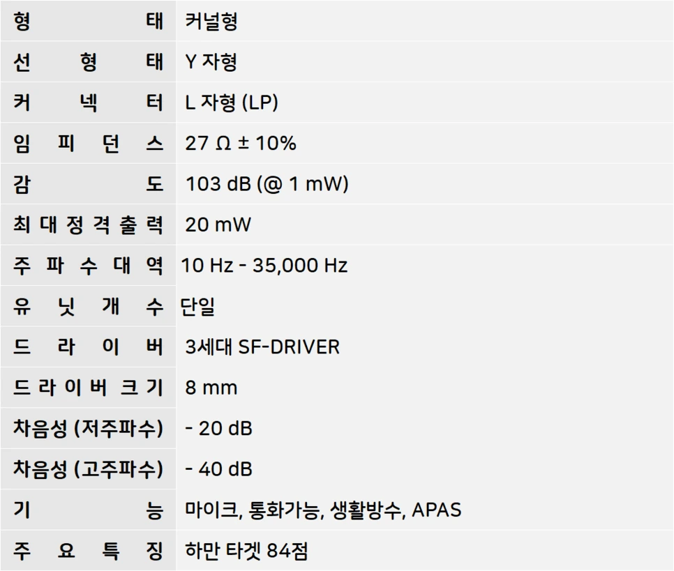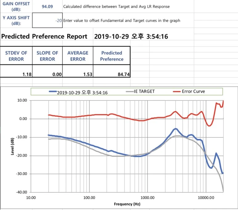 하만 타겟과 상당히 높은 일치도를 보여주면서 선호도 점수는 84.74점으로 세계 최고 점수를 기록했습니다. 즉, 하만 타겟에 상당히 근접한 일치도를 가지고 있으며, 상당히 우수하고 높은 성능을 제공해준다고 볼 수 있습니다. 그것도 듀얼도 아닌 싱글 드라이버 제품이 말이지요. 여러모로 성능 측정 결과 값만 보고 이야기하면 뛰어난 제품입니다.
