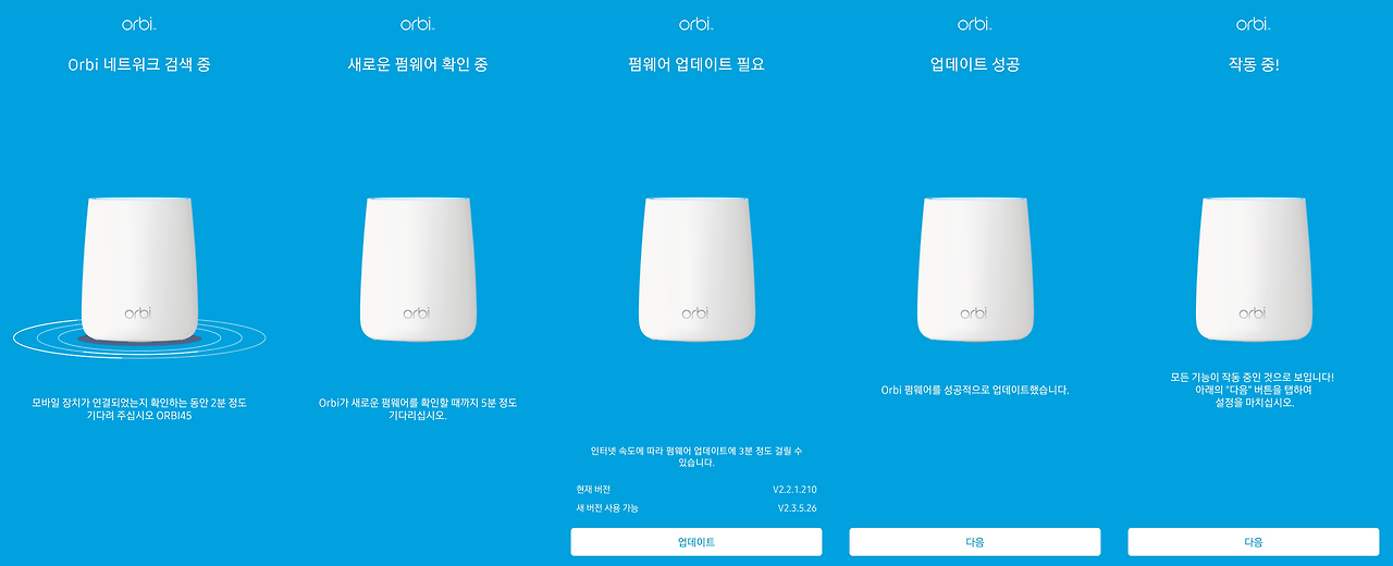 새틀라이트 설정이 끝나고 나면 펌웨어 버전을 확인하고 최신 펌웨어가 있는지 확인 후 업데이트가 이루어집니다. 업데이트가 완료되고 나면 모든 기본 설정 작업이 마무리되고 본격적으로 개인 설정을 하실 수 있습니다.