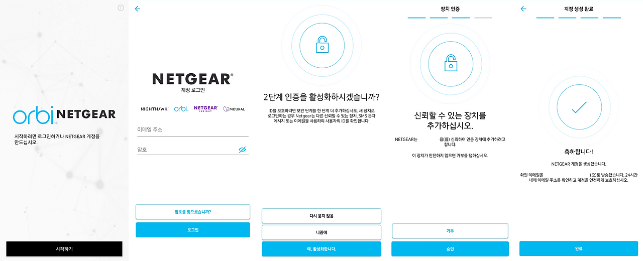 넷기어에서 출시된 공유기 설정 앱 같은 경우 모두 넷기어 계정 로그인 과정이 있으며 모든 계정은 공용으로 사용할 수 있습니다.