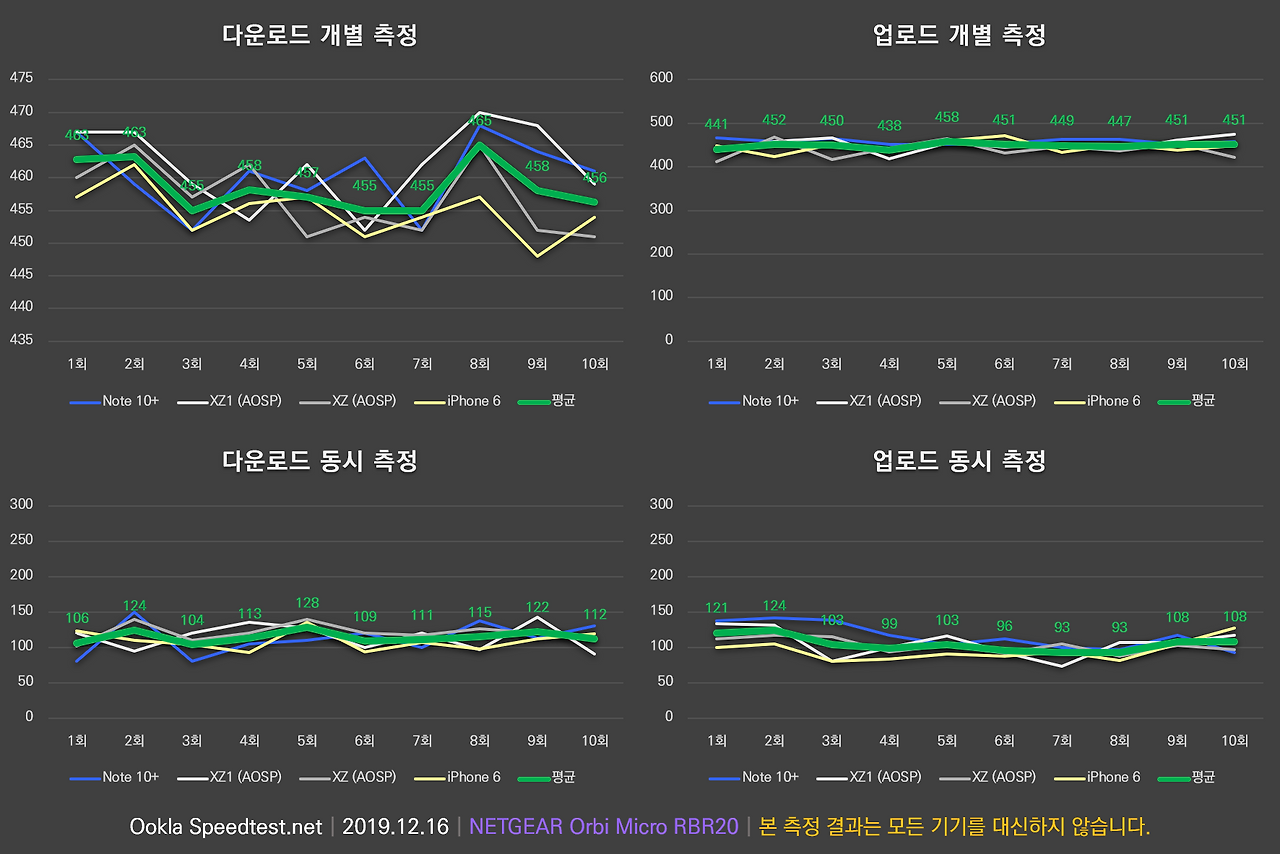 각 단말기들 연결하고 개별 측정과 동시 측정을 진행해본 결과 다운로드(개별/동시) 459/114 Mbps, 업로드(개별/동시) 449/105 Mbps로