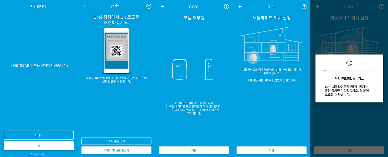 새 제품 설치를 시작하면 QR코드를 스캔하여 오르비에 바로 연결되며 이후 새틀라이트 기능이 활성화되어 설정이 진행됩니다.