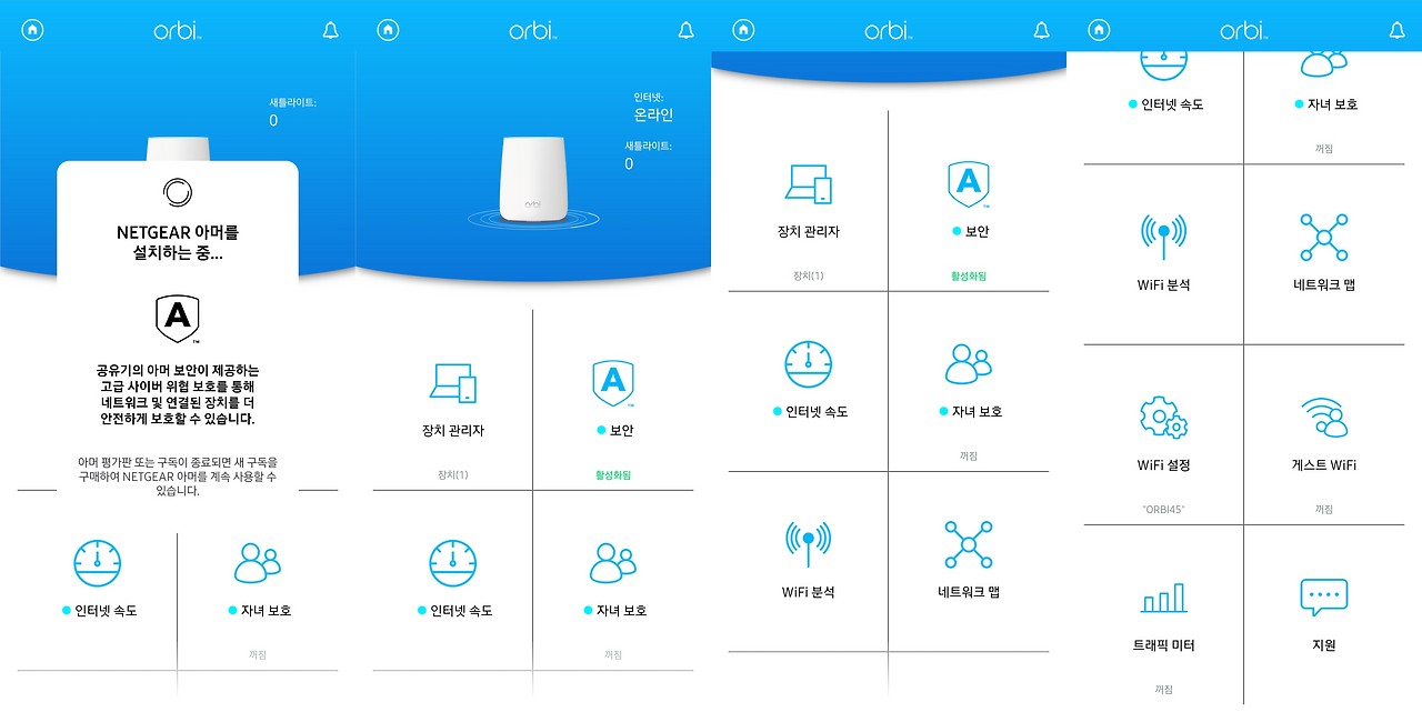 오르비 RBR20에 전원과 인터넷 케이블을 연결하고 스마트폰에서 마켓을 통해 넷기어 오르비 앱을 설치해서 세팅하고, 몇 가지 기능을 살펴보도록 하겠습니다.