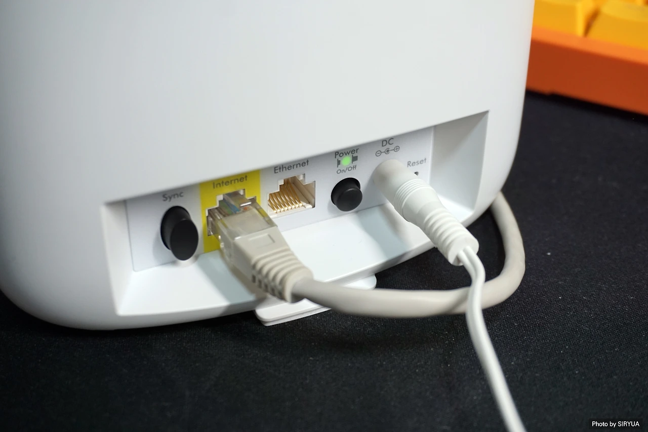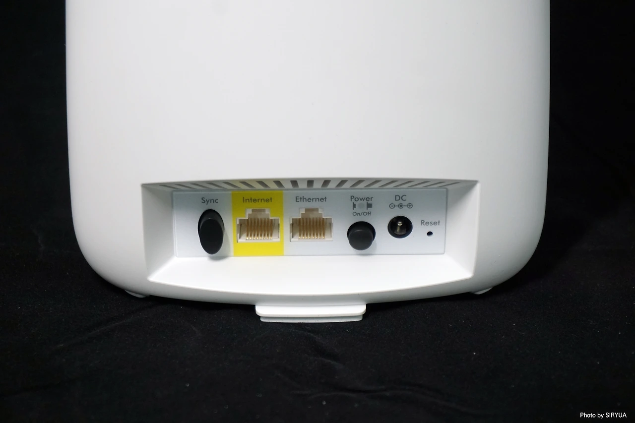 후면부 아래에는 왼쪽부터 새틀라이트 동기화(Sync) · 인터넷(WAN) · 이더넷(LAN) · 전원(ON/OFF) · DC 전원입력 포트 · 리셋 스위치가 위치하고 있습니다. 그리고 그 위로는 쿨링을 위한 환기구가 있습니다.