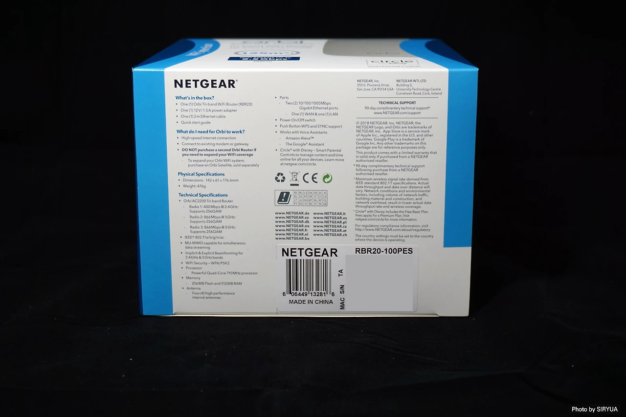 후면에는 제품의 주요 특징인 Fastlane3, 자녀보호(디즈니 서클), 최대 2.2Gbps의 고속 와이파이 성능, 새틀라이트 기능에 대한 안내가 있으며, 아랫면에는 각종 제품 인증 정보와 기술사양이 적혀있습니다.