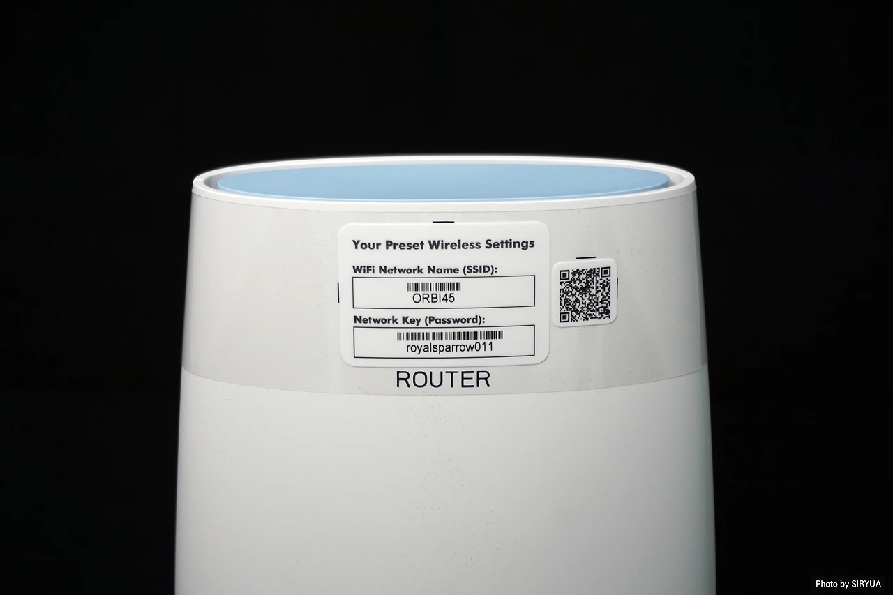 오르비를 개봉하고 난 뒤 가장 먼저 볼 수 있는 것은 본체 상단에 거치되어 있는 SSID와 비밀번호 그리고 QR코드 스티커입니다.