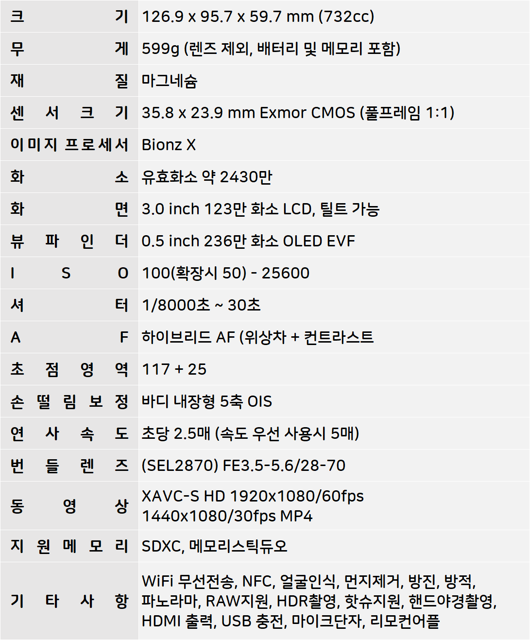 제가 구매한 A7M2K는 A7M2에 SEL2870 렌즈가 포함된 기본 렌즈킷입니다. SEL2870은 줌 조절에 따라서 조리개 값이 변하는 가변 조리개 렌즈로 이너 포커스 구조를 가지고 있어서 촬영 거리가 변경되어도 길이가 변하지 않습니다. 다만, 이너 줌 구조는 아니기 때문에 줌 조절에 따라서 코가 튀어나오지만 약간 나오는 구조이다 보니까 크게 길이 변화를 느끼기는 힘듭니다. 여담으로, SEL2870은 번들로 제공되는 렌즈임에도 불구하고 성능이 뛰어나서 가성비가 좋은 렌즈로 많이 알려져 있습니다.