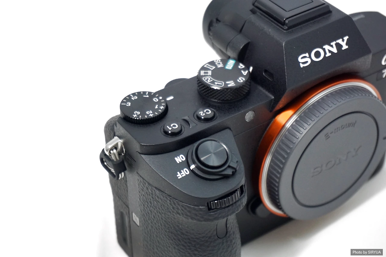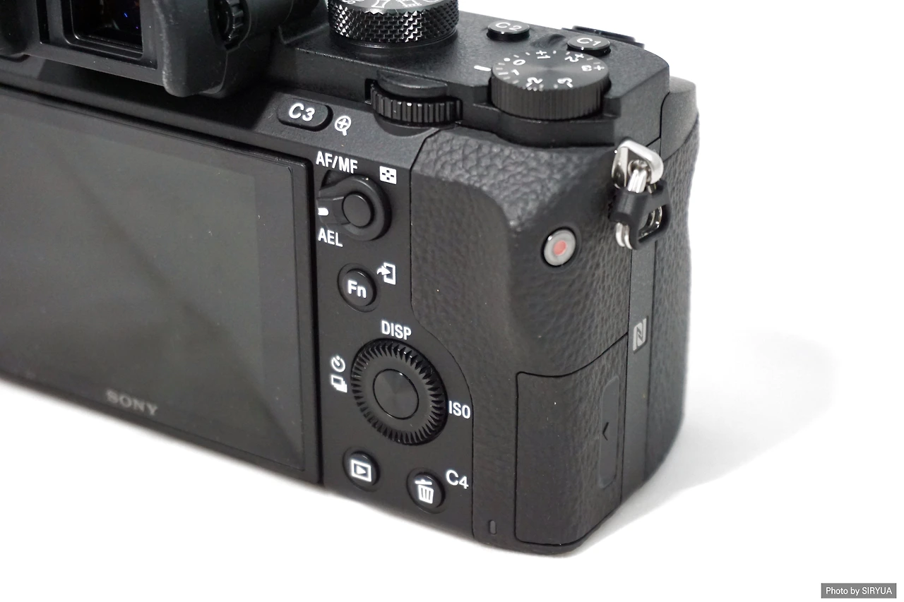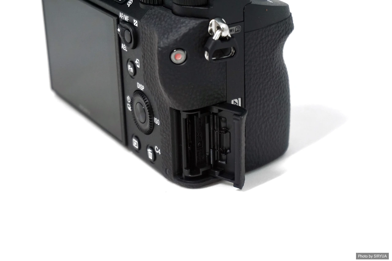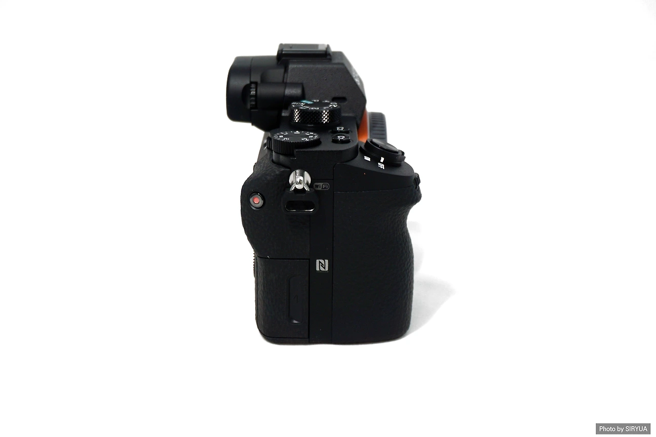 우측의 그립은 그리 두껍지 않고 적당한 것이 손에 쥐었을 때 꽤나 안정적이다는 느낌을 많이 줍니다. 다만, 제가 손이 조금 크다 보니까 은근슬쩍 약간만 더 컸으면 더 좋았을 것 같다는 생각이 없지 않아 들기도 합니다. (그럴 거면 더 커진 A7M3를 사지..) 그립 중앙에는 NFC가 위치하고 있어서 원터치 연결을 사용할 때 스마트폰을 이쪽으로 가져다 되면 빠르게 연결해서 사용할 수 있습니다.