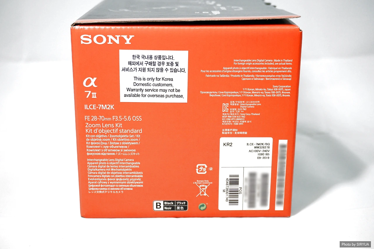 A7M2의 박스 디자인은 어두운 색상에 오른쪽 면만 주황색으로 포인트를 주고 있습니다. 그래서 그런지 몰라도 그동안 제가 본 소니 제품 패키지 중에서는 가장 고급스러운 느낌을 주고 있습니다. 좌측 상단으로는 소니 로고와 제품명이 우측으로는 기본 번들 렌즈와 결합된 A7M2의 사진이 있으며, 좌측 하단에는 정품 등록하고 혜택을 받자는 스티커가 붙어있습니다. 스티커 아래쪽에는 정품 등록 시 같이 입력해야 되는 코드가 복권 긁듯이 볼 수 있게 되어있는데.. 판매원분께 왜 이렇게 되어있냐고 여쭈어보니까, 기본 렌즈킷 패키지에서 렌즈만 빼고 보디만 파는 경우가 있어서 구성 보호 목적으로 소니에서 이렇게 판매하고 있다고 합니다.