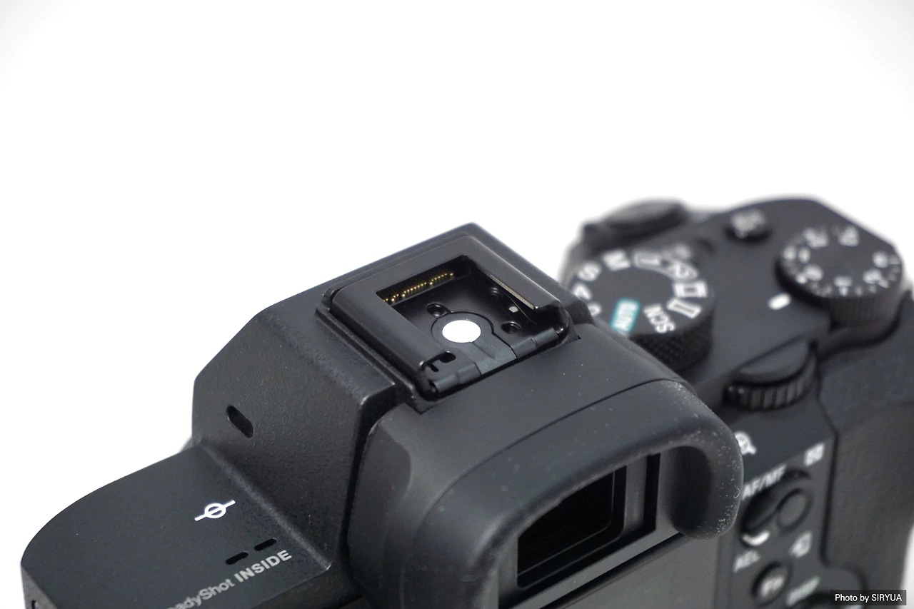 뷰파인더 위에는 멀티 인터페이스 슈(Multi Interface Shoe, 이하 Mi 슈)가 위치하고 있습니다. 이를 통해서 정품 액세서리로 출시되고 있는 플래시 키트부터 시작하여 마이크 등 다양한 보조 장치들을 장착할 수 있으며, 필요에 따라서는 별도의 어댑터를 이용해서 서드파티 액세서리를 장착해서 사용하거나 스마트폰을 장착해서 리모컨 기능을 활용, 틸트 대신 180도 돌려서 디스플레이로 활용할 수 있습니다.