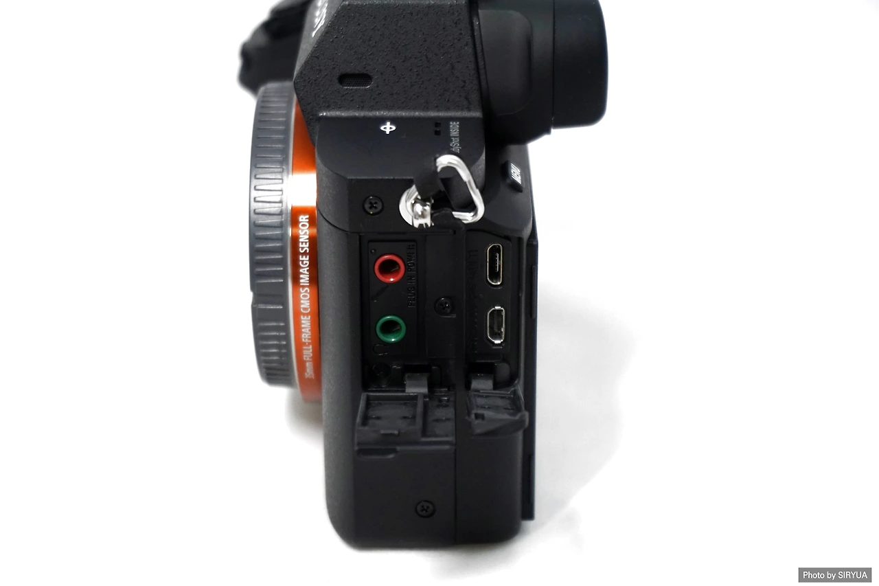 A7M2 좌측을 보면 3.5 파이 잭 단자를 사용하는 외부 스피커와 마이크, 그리고 마이크로 USB와 HDMI 포트가 커버에 덮여 있습니다.