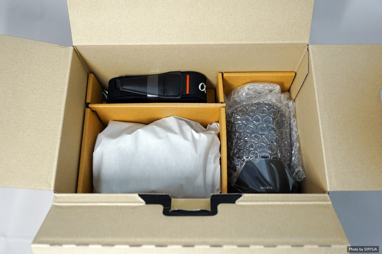 가이드북을 치우고 열어보면 드디어 오늘의 주인공 A7M2가 하얀 종이 커버에 씌워져 포장되어 있는 것을 볼 수 있습니다. SEL2870 렌즈가 뽁뽁이에 쌓여서 끼워져 있고요. 구성품들을 다 꺼내서 무엇무엇 담겨있는지 보겠습니다.