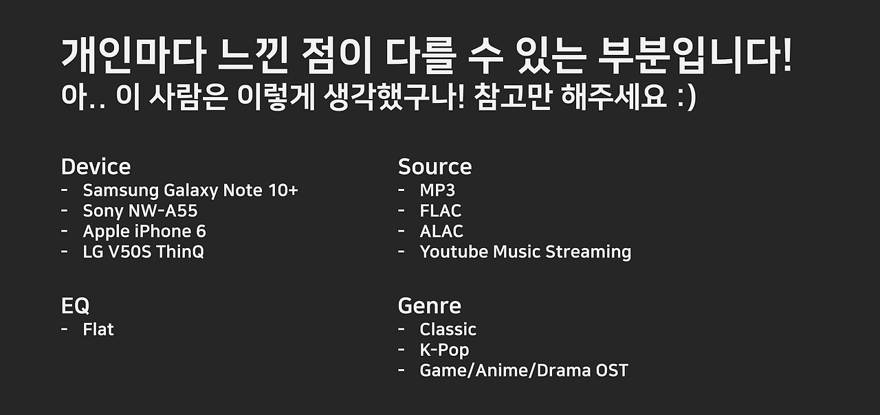 하지만, 클래식과 가요를 비롯하여 자주 듣는 노래들을 중심으로 이틀 정도 에이징을 하고 난 이후에 들려오는 소리는 확실하게 달라져있었습니다. 저음이 상당히 든든하게 '둥~ 둥~' 하면서 귓속으로 잘 울려주었으며, 보컬을 비롯하여 다양한 영역대의 악기 소리들이 막힘없이 잘 들려왔습니다. 전반적으로 봤을 때는 저음에 포커스가 많이 맞추어져 있지만 밸런스가 나름 괜찮은 것이 튜닝이 잘 되어있었습니다.
