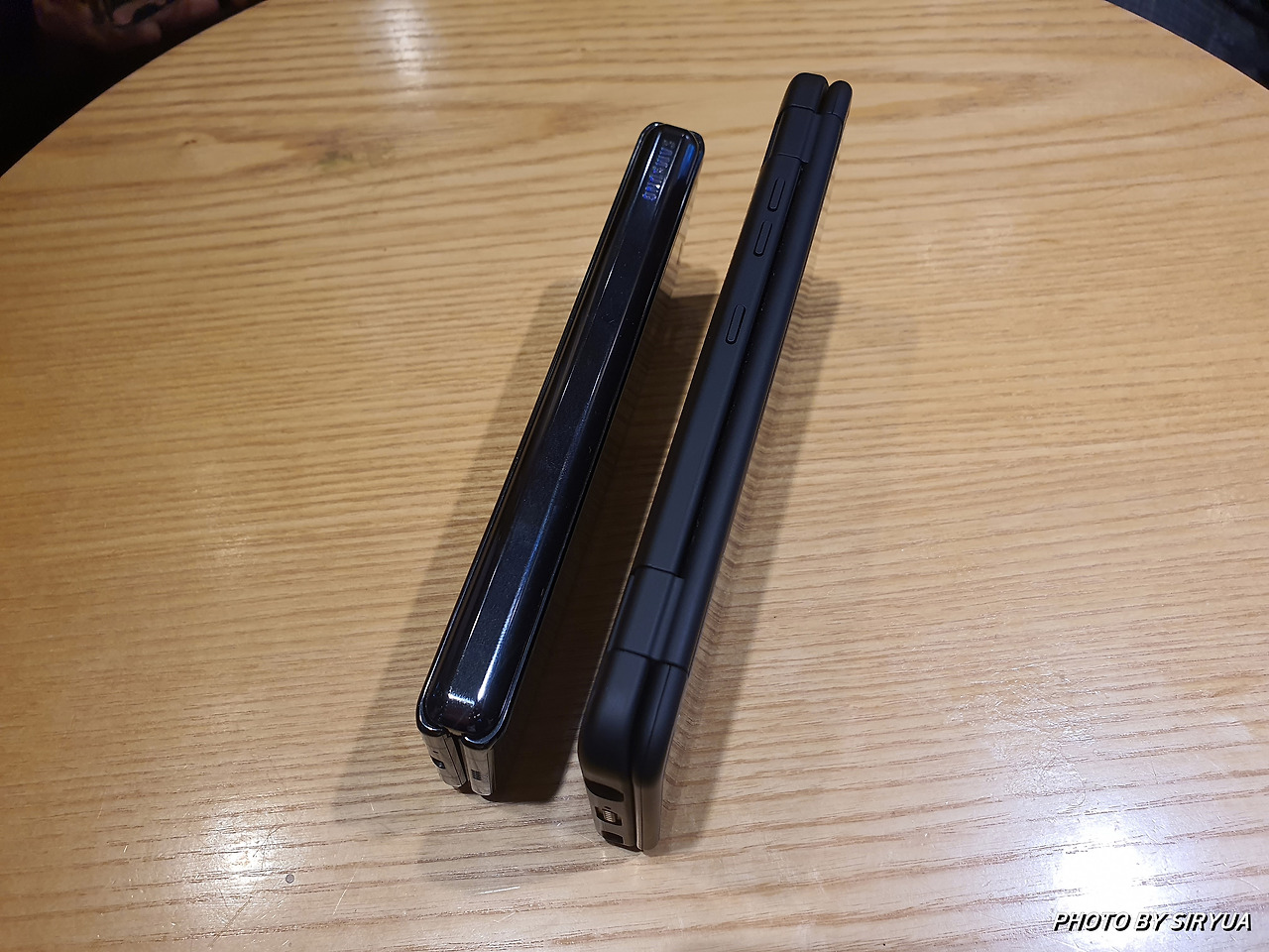 접은 상태에서 두께 차이는 같이 나란히 놓고 비교해보았을 때 두 제품 다 큰 차이 없이 비슷한 두께를 가지고 있습니다.