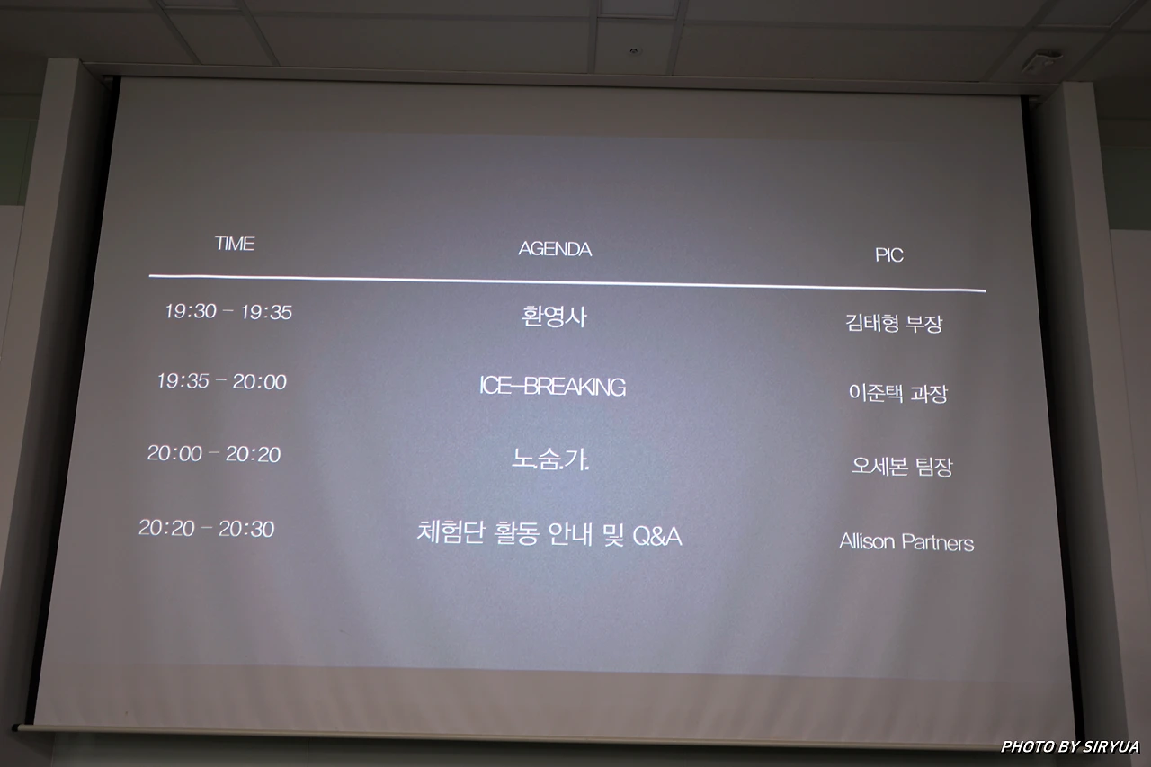 저녁 식사 이후에는 본격적으로 행사가 시작되었습니다. 행사 진행은 환영사 → 아이스브레이킹 → 노. 숨. 가. 순으로 진행되었으며, 마지막에는 체험단 진행 관련 안내와 Q&A 시간이 있었습니다. 행사 시간이 시간인지라 진행 자체는 전반적으로 빠르게 진행되었습니다.